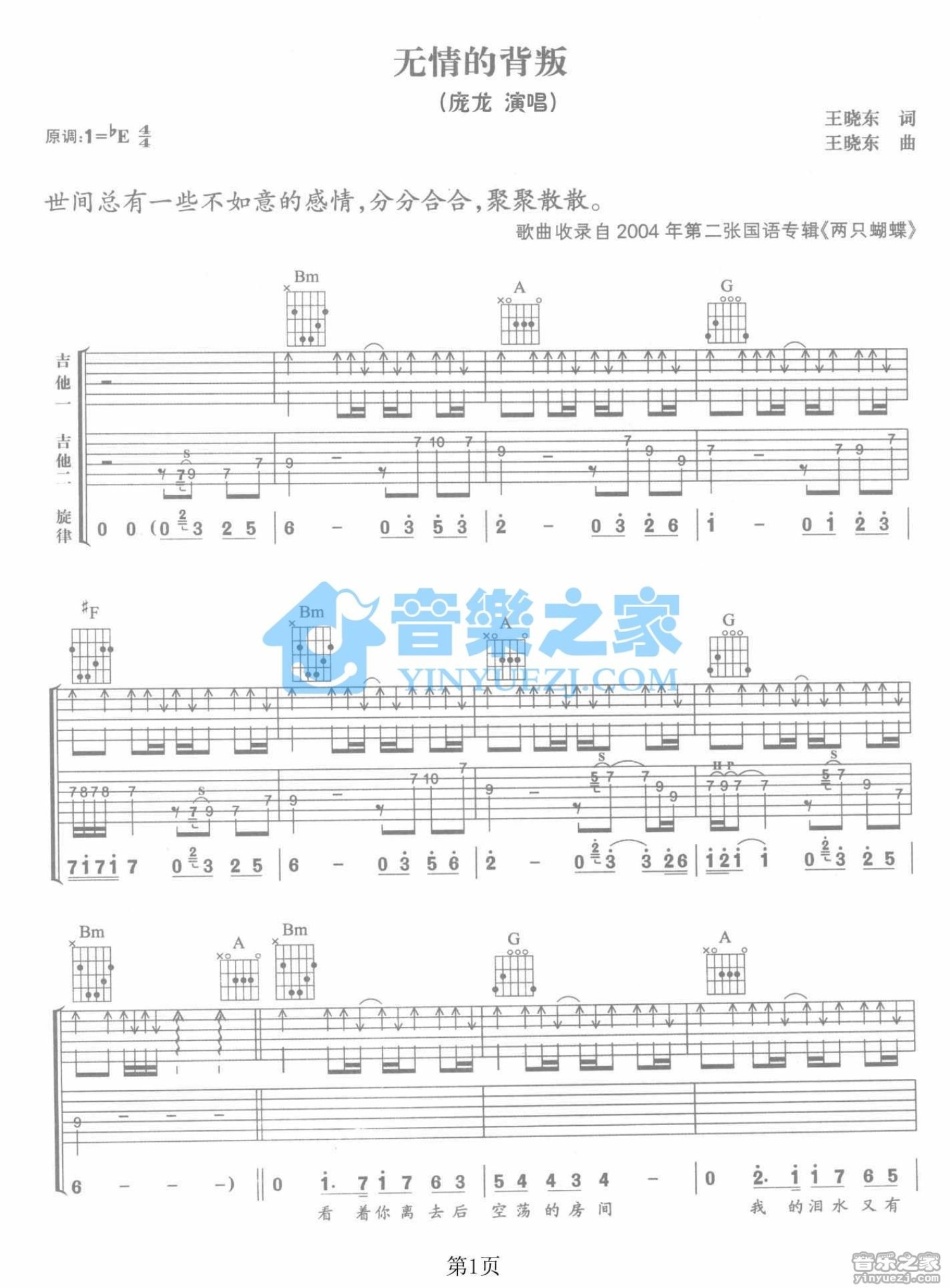 曲谱介绍: bE调双吉他版 庞龙《无情的背叛》吉他弹唱六线谱