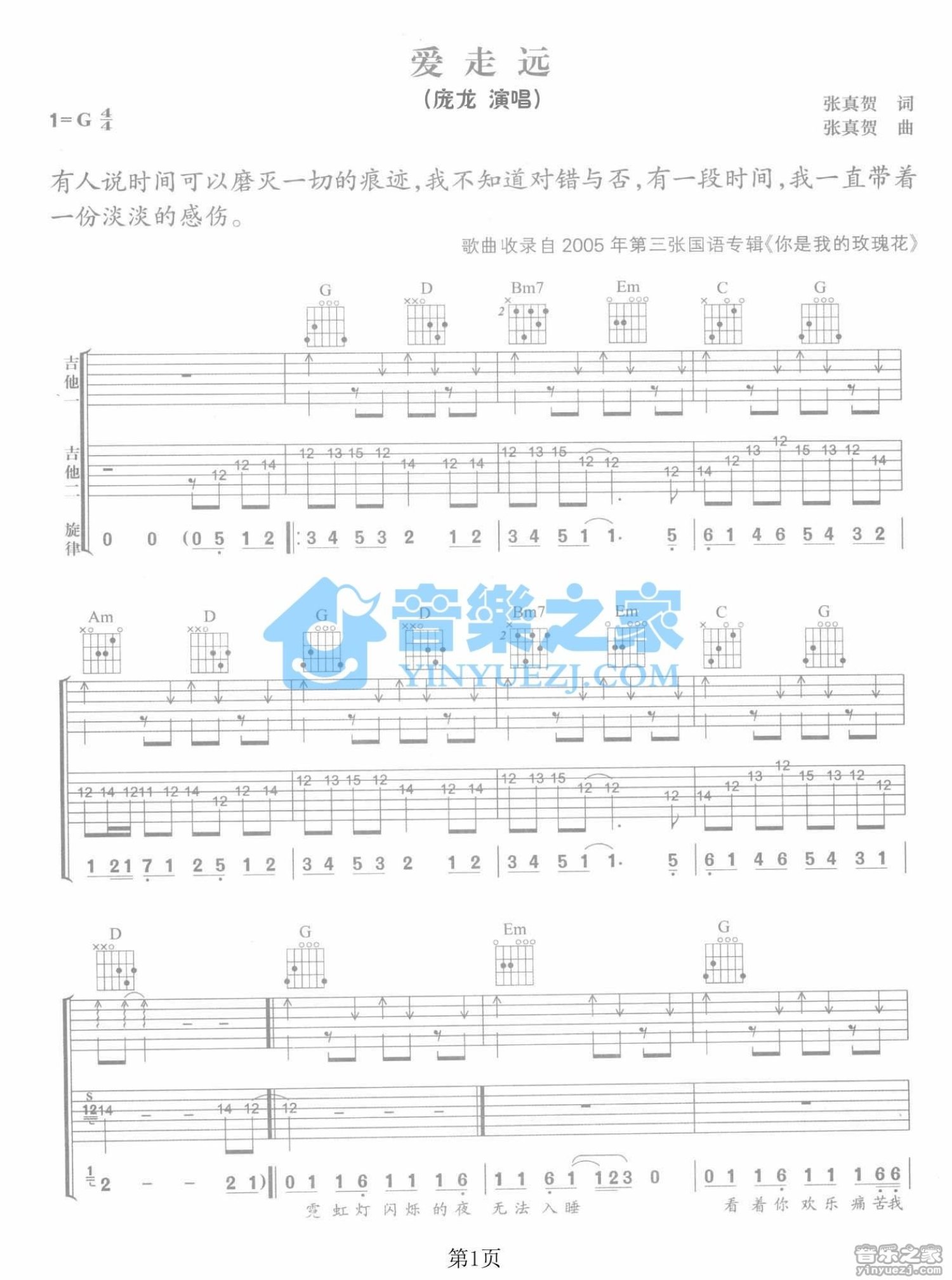 曲谱介绍: G调双吉他版庞龙《爱走远》吉他弹唱六线谱