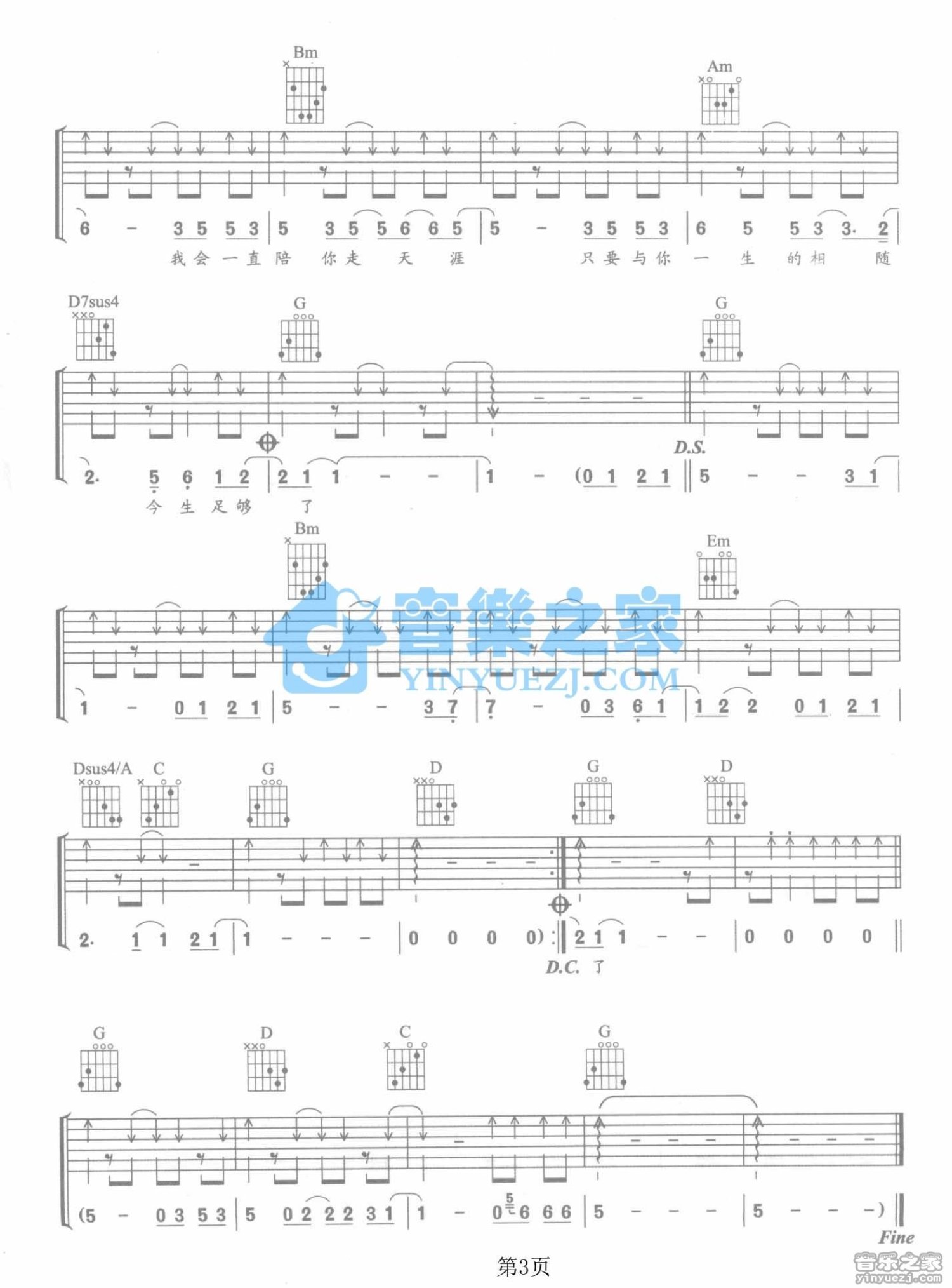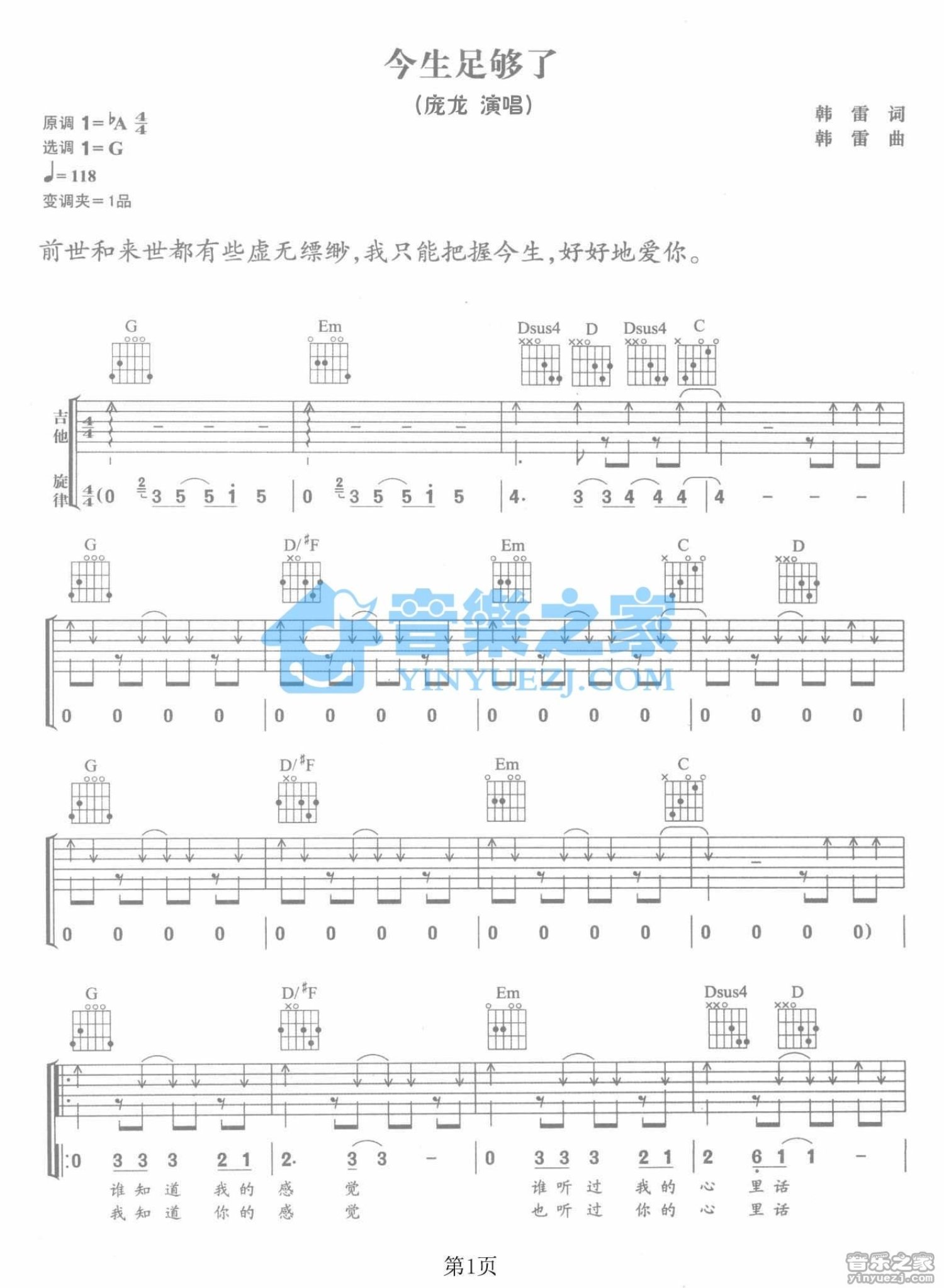曲谱介绍: G调版庞龙《今生足够了》吉他弹唱六线谱