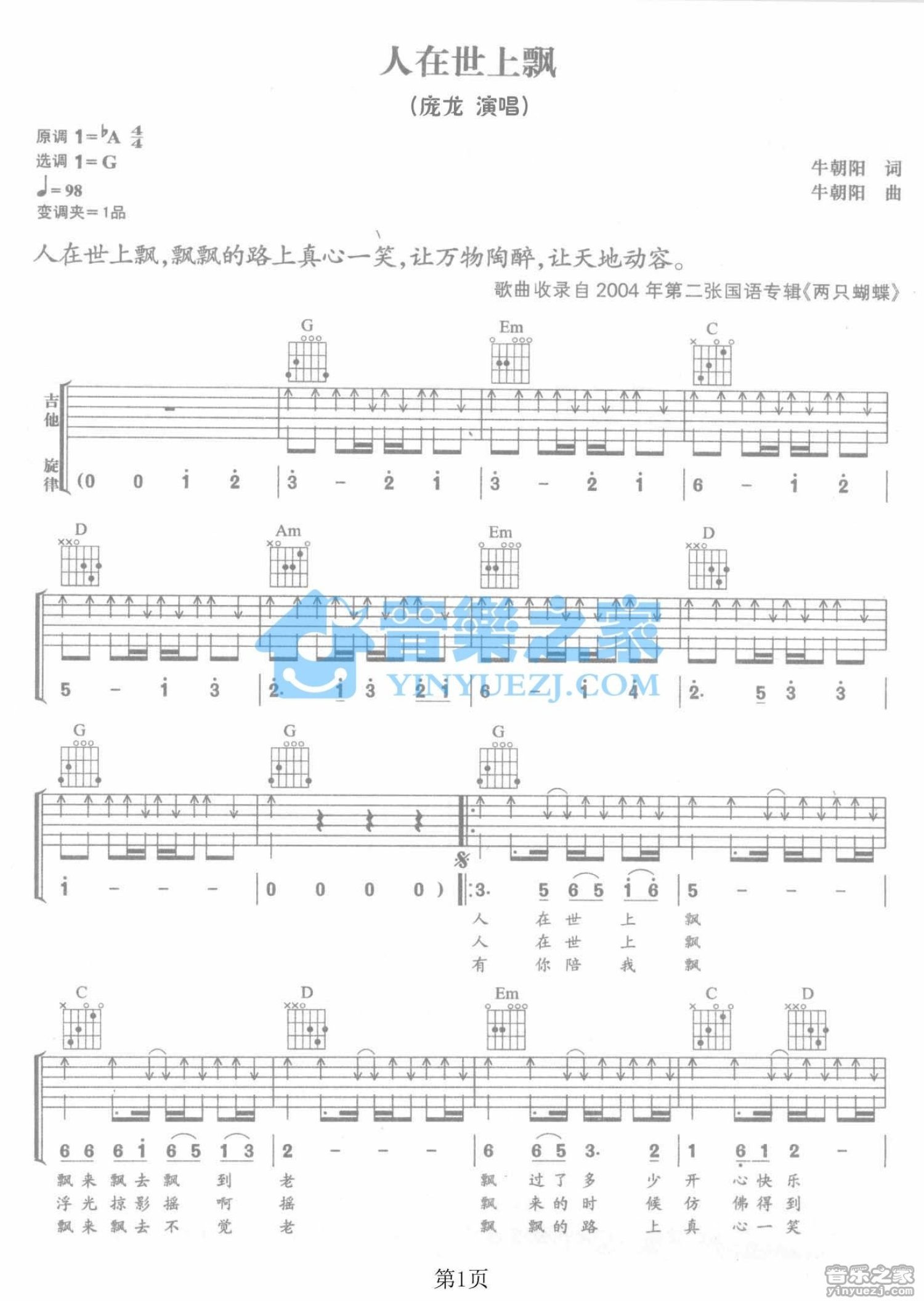 曲谱介绍: G调版庞龙《人在世上飘》吉他弹唱六线谱