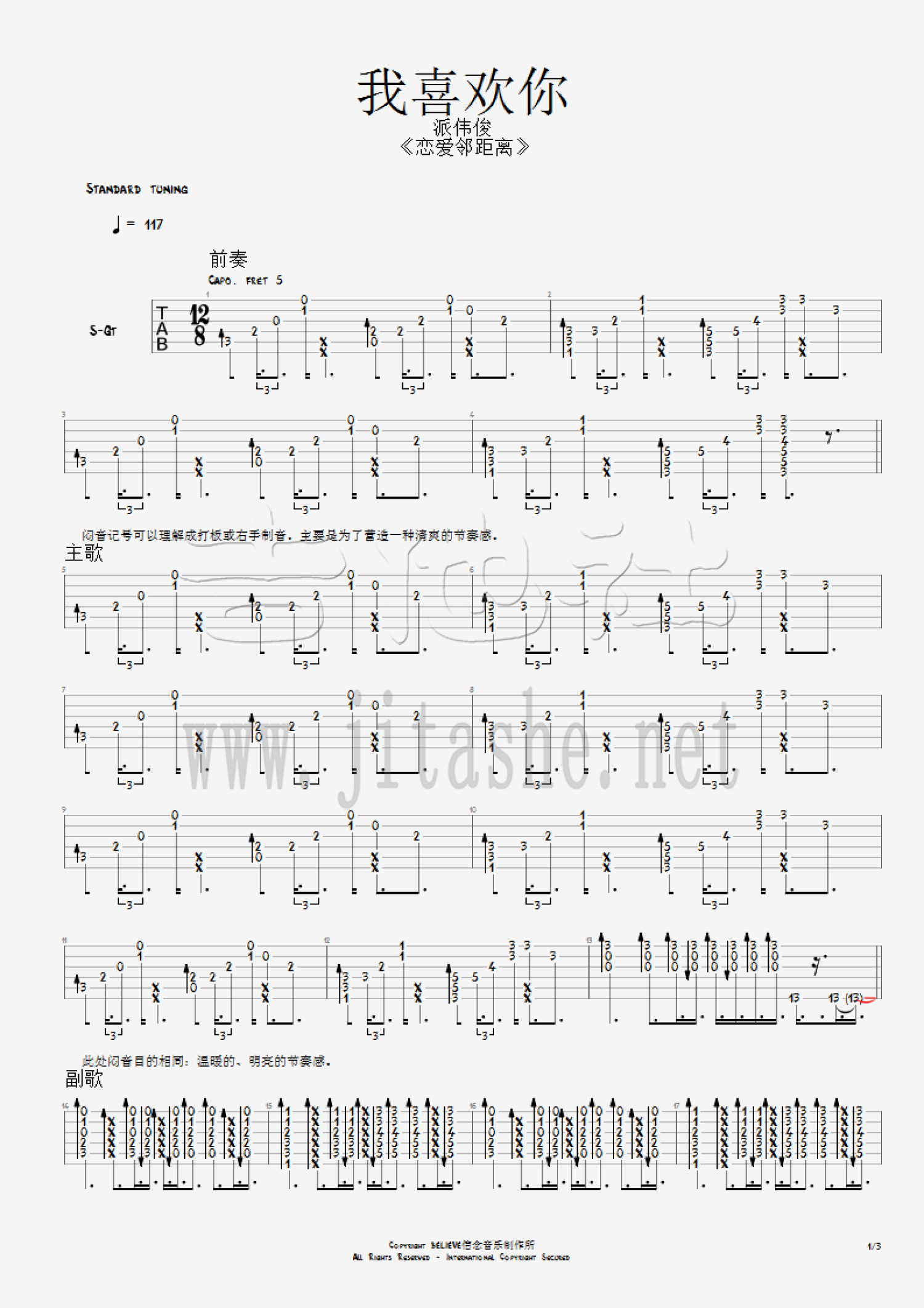 曲谱介绍: 双吉他版派伟俊《我喜欢你》吉他弹唱六线谱