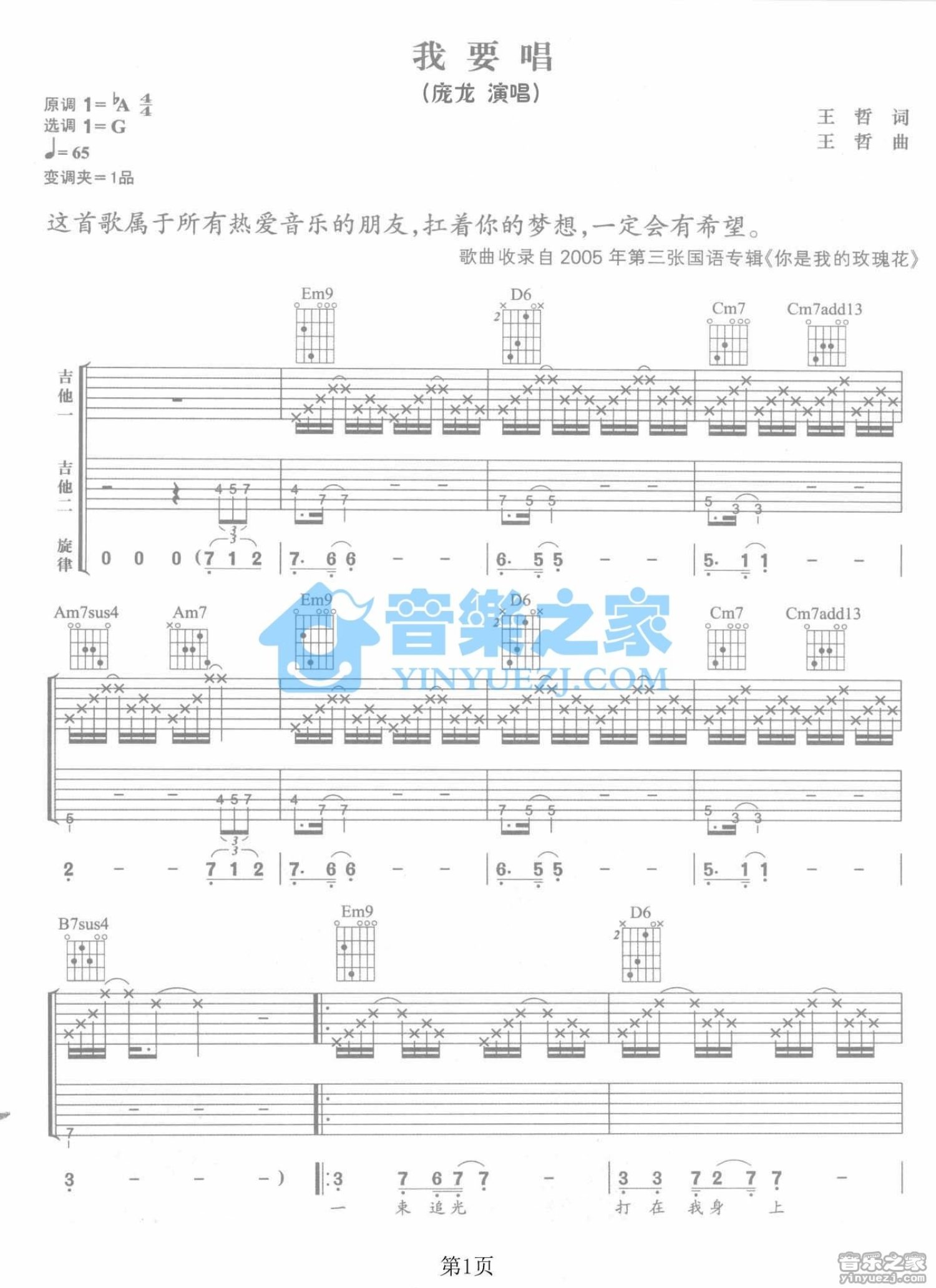 曲谱介绍: G调庞龙《我要唱》吉他弹唱六线谱