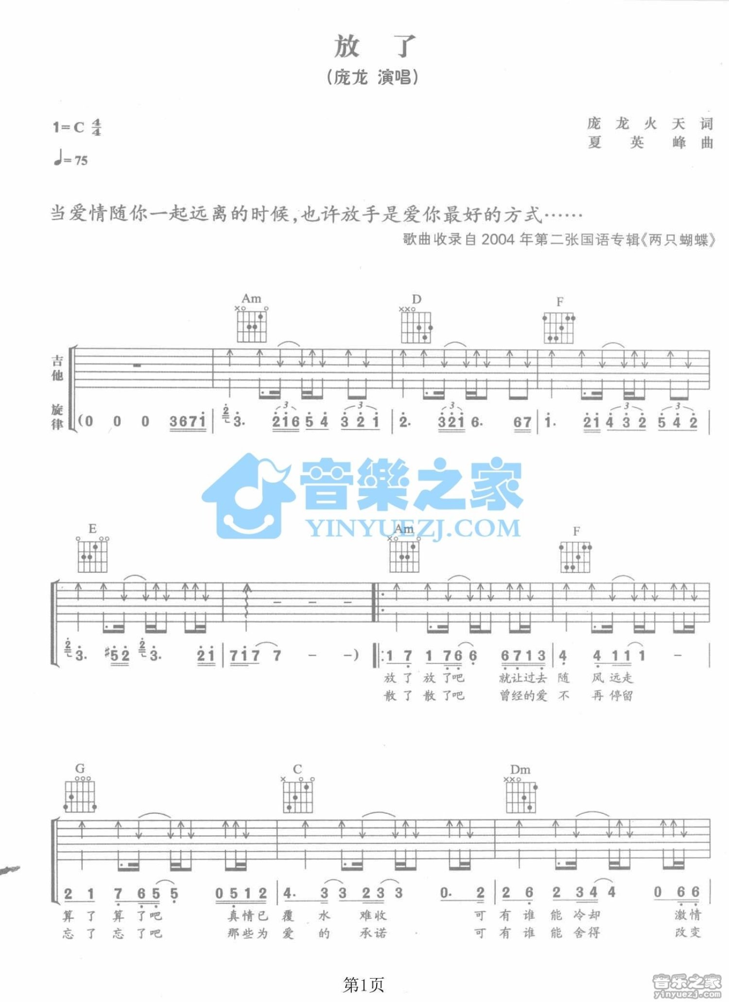 曲谱介绍: C调版庞龙《放了》吉他弹唱六线谱