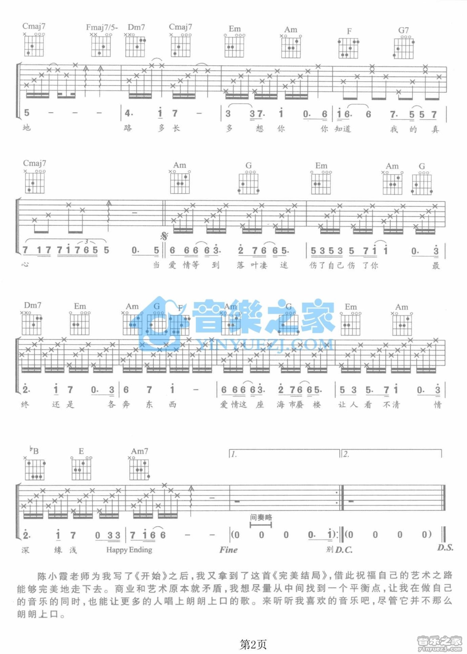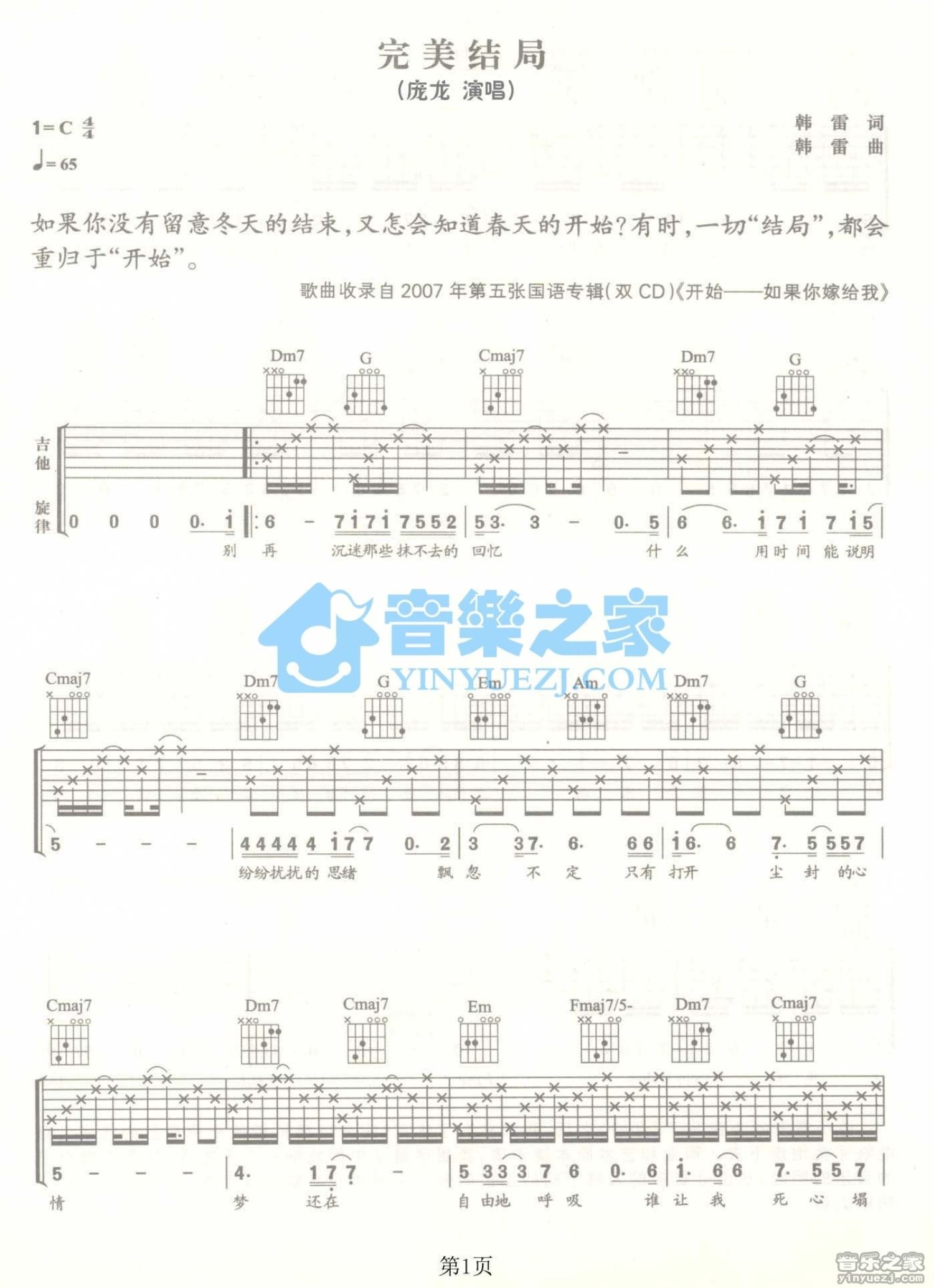 曲谱介绍: C调版庞龙《完美结局》吉他弹唱六线谱