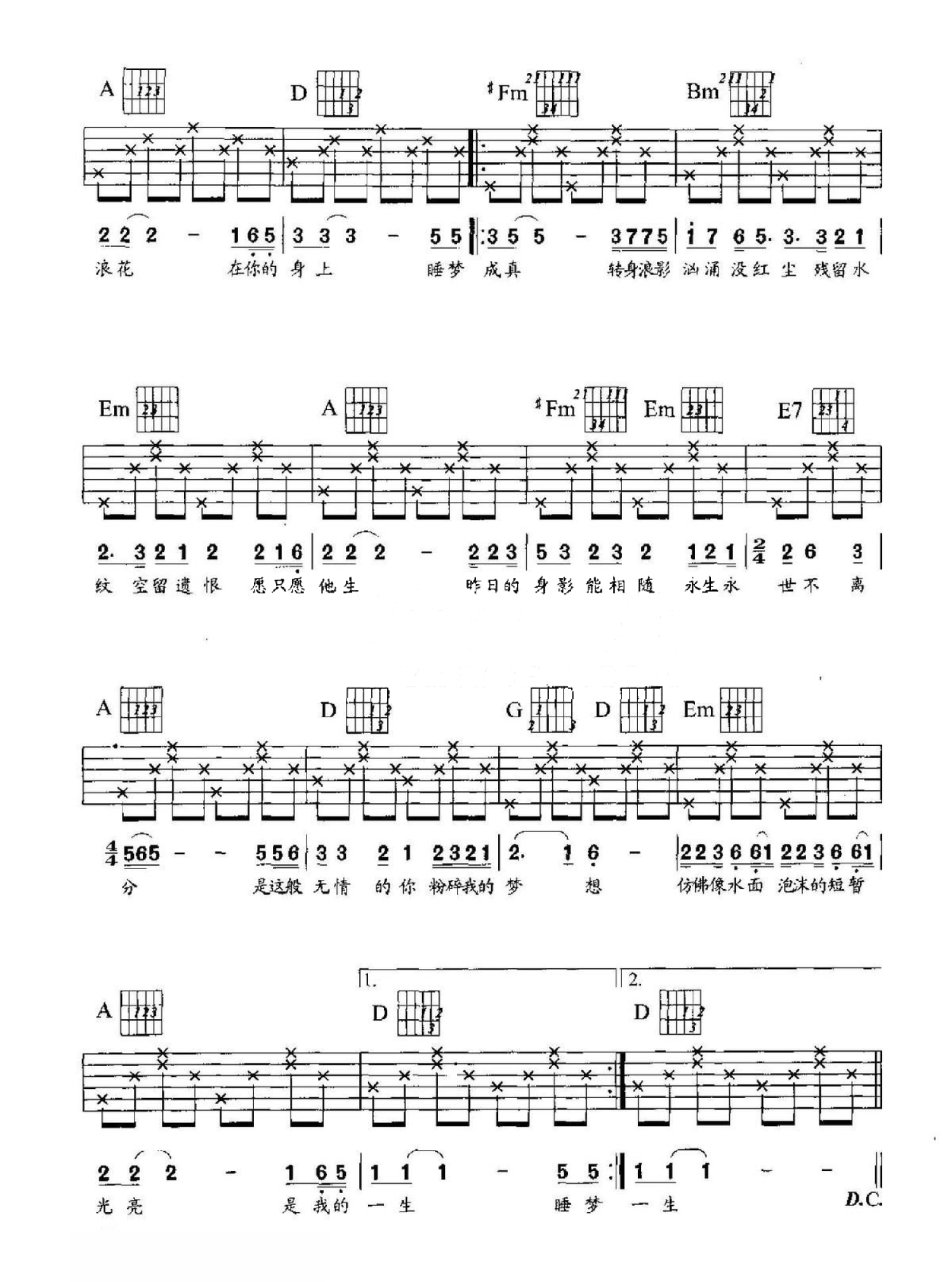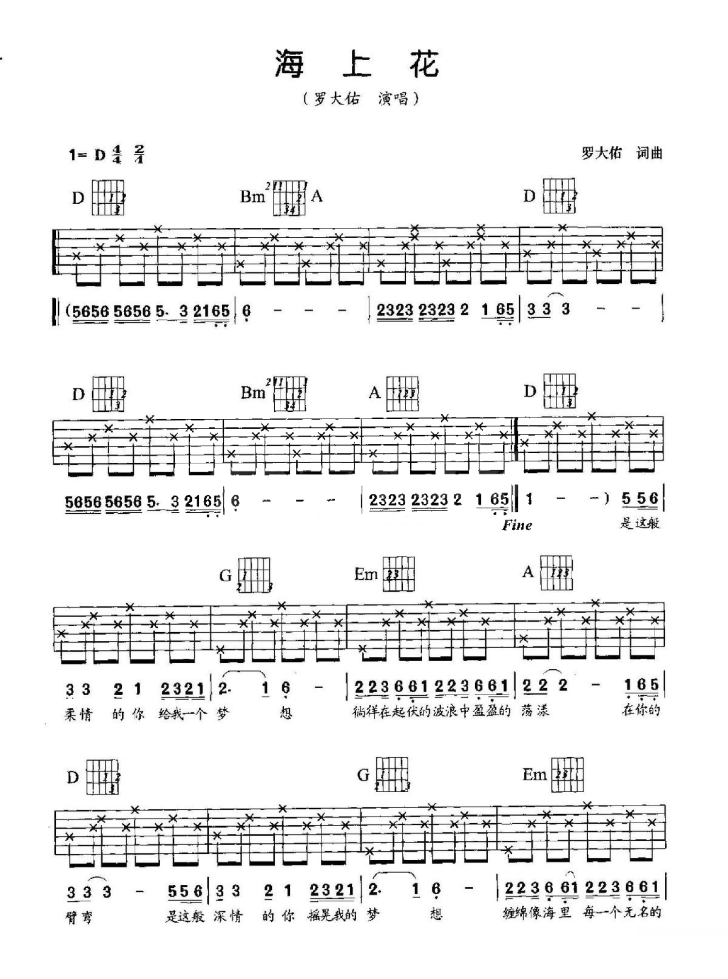曲谱介绍: D调版罗大佑《海上花》吉他弹唱六线谱