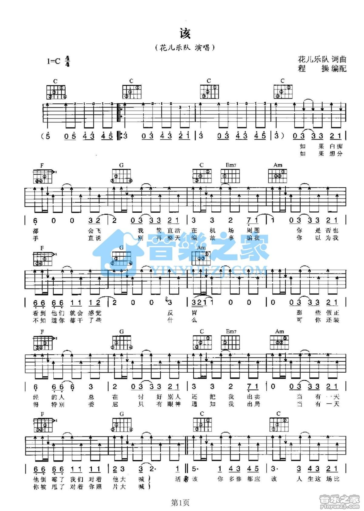 曲谱介绍: C调版花儿乐队《该》吉他弹唱六线谱