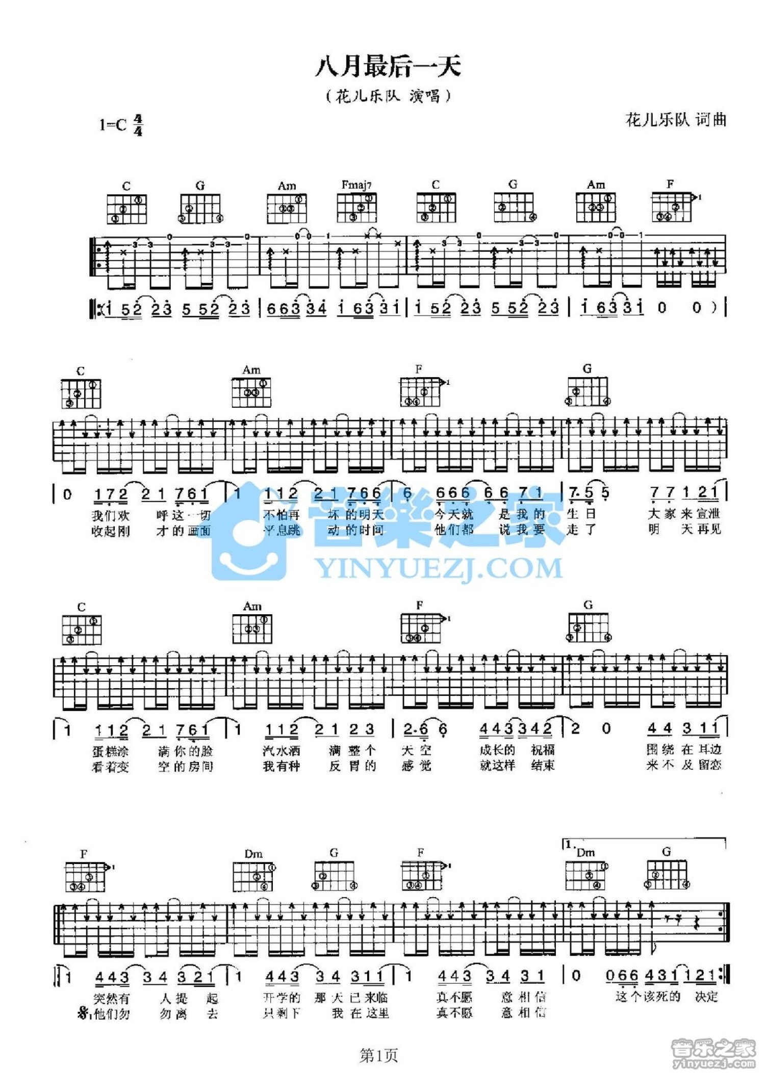 曲谱介绍: C调版花儿乐队《八月最后一天》吉他弹唱六线谱