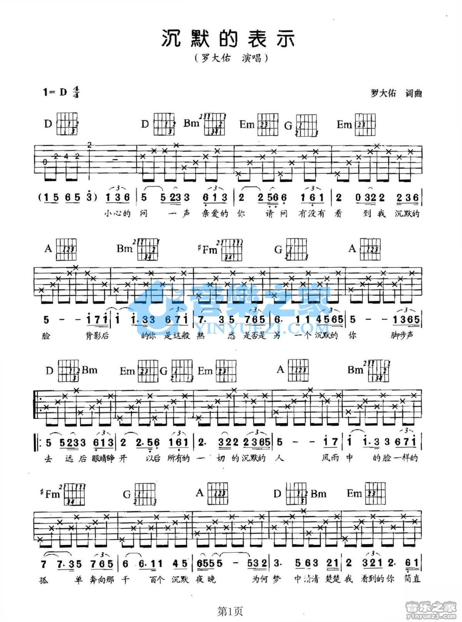 曲谱介绍: D调版罗大佑《沉默的表示》吉他弹唱六线谱