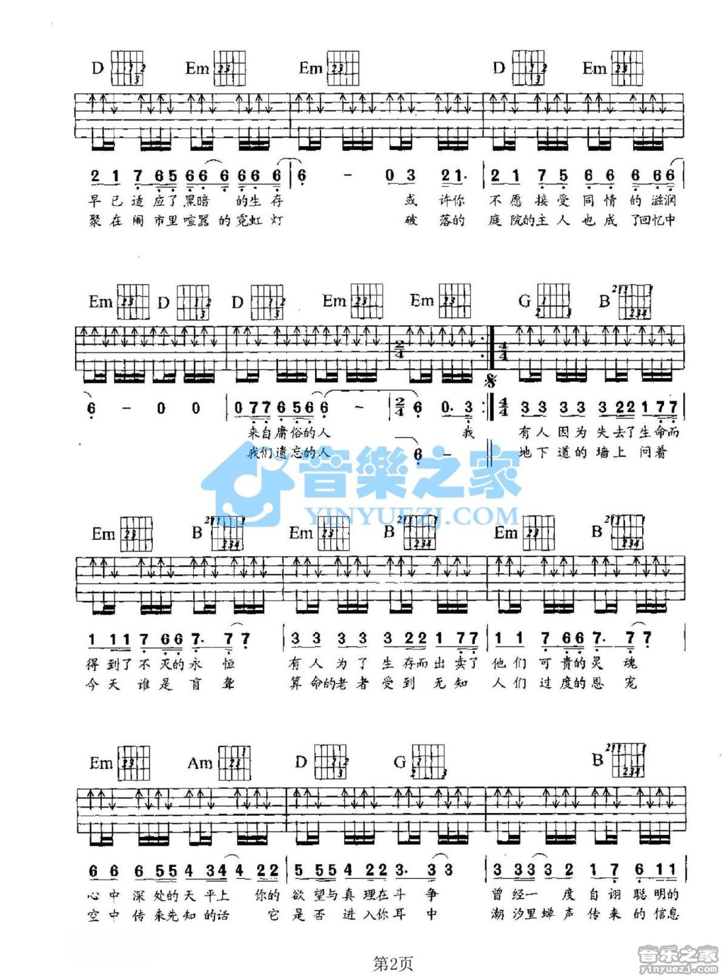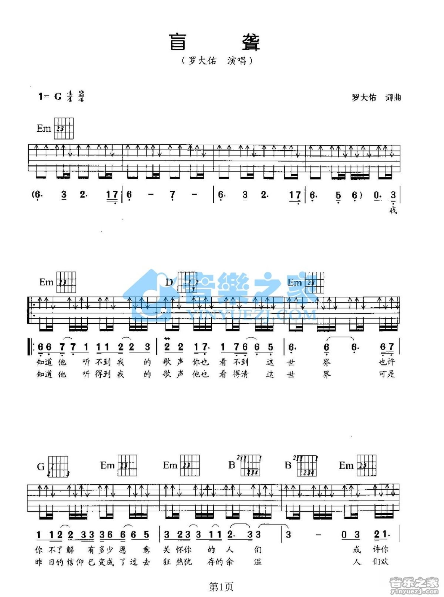 曲谱介绍: G调版罗大佑《盲聋》吉他弹唱六线谱