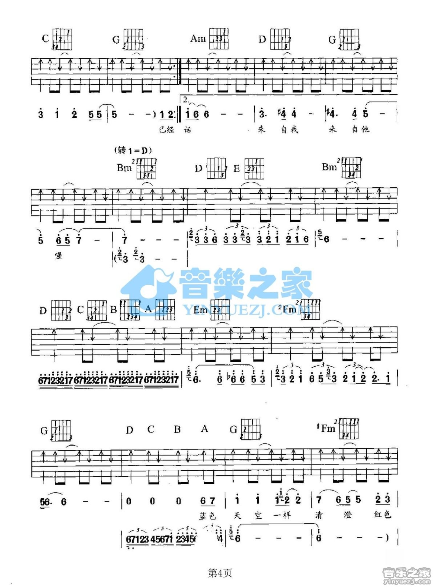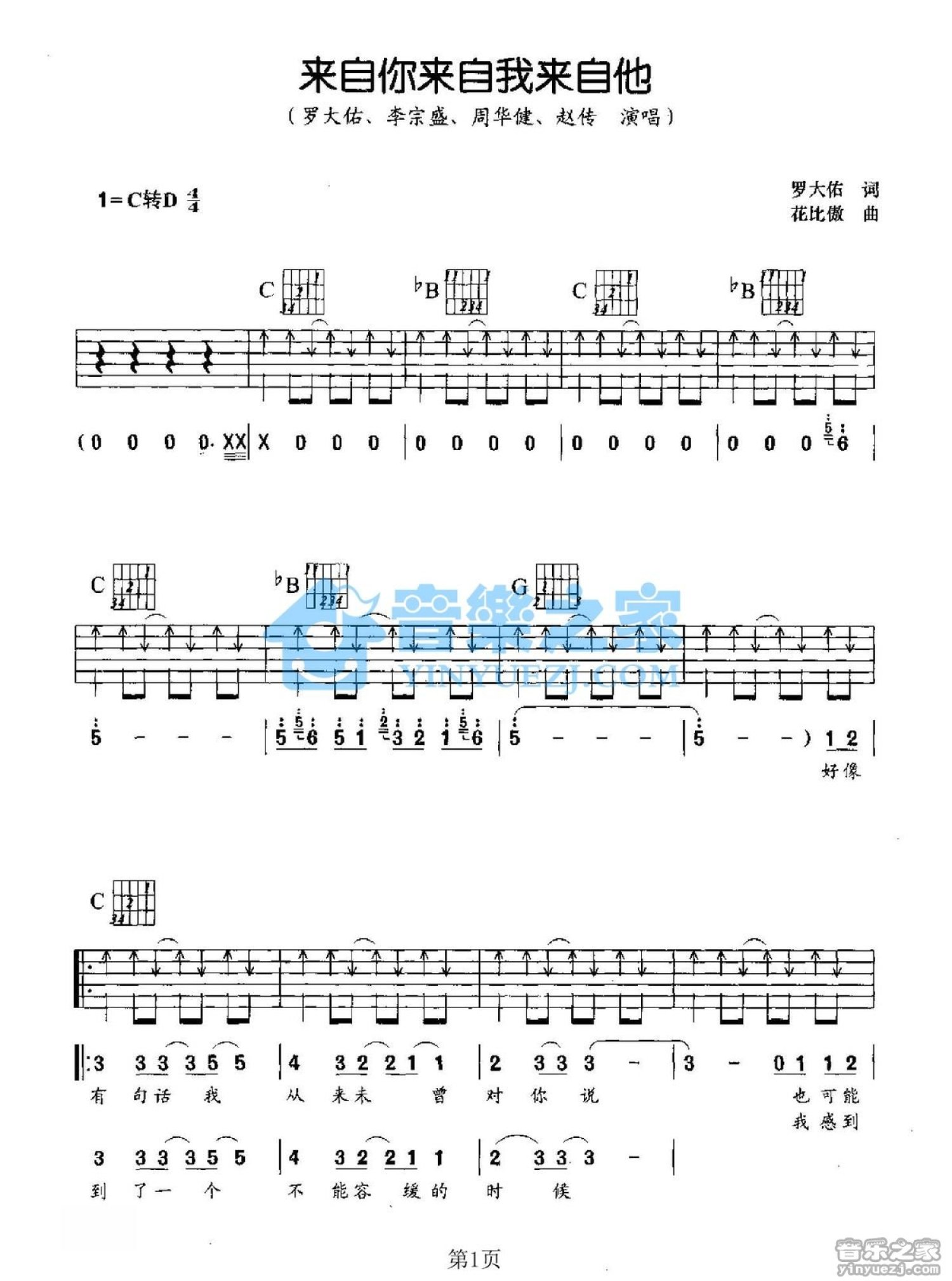 曲谱介绍: C调版罗大佑《来自你来自我来自他》吉他弹唱六线谱