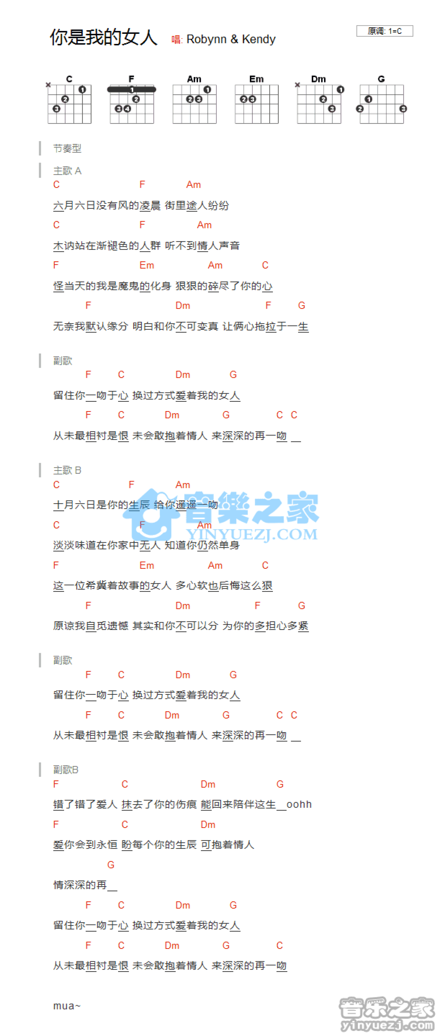 曲谱介绍: C调版Robynn/Kendy《你是我的女人》吉他和弦弹唱谱