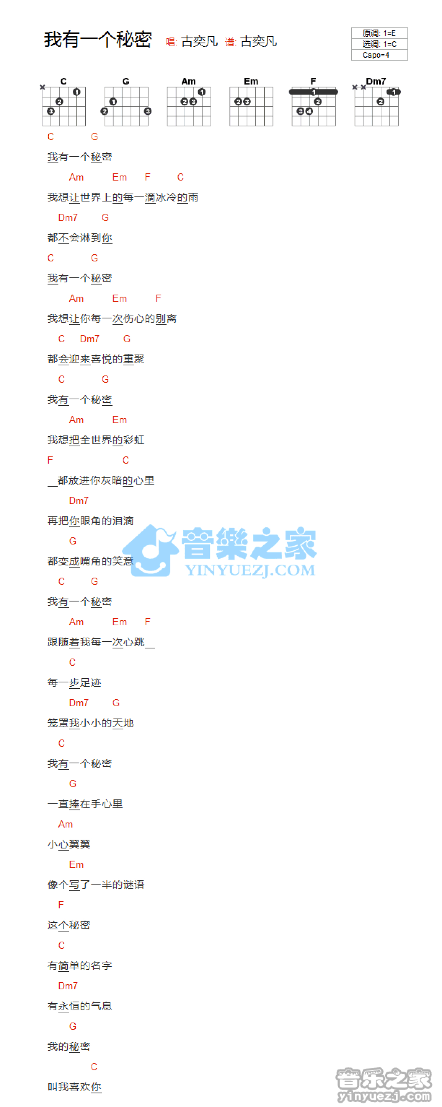 曲谱介绍: C调版古奕凡《我有一个秘密》吉他和弦弹唱谱