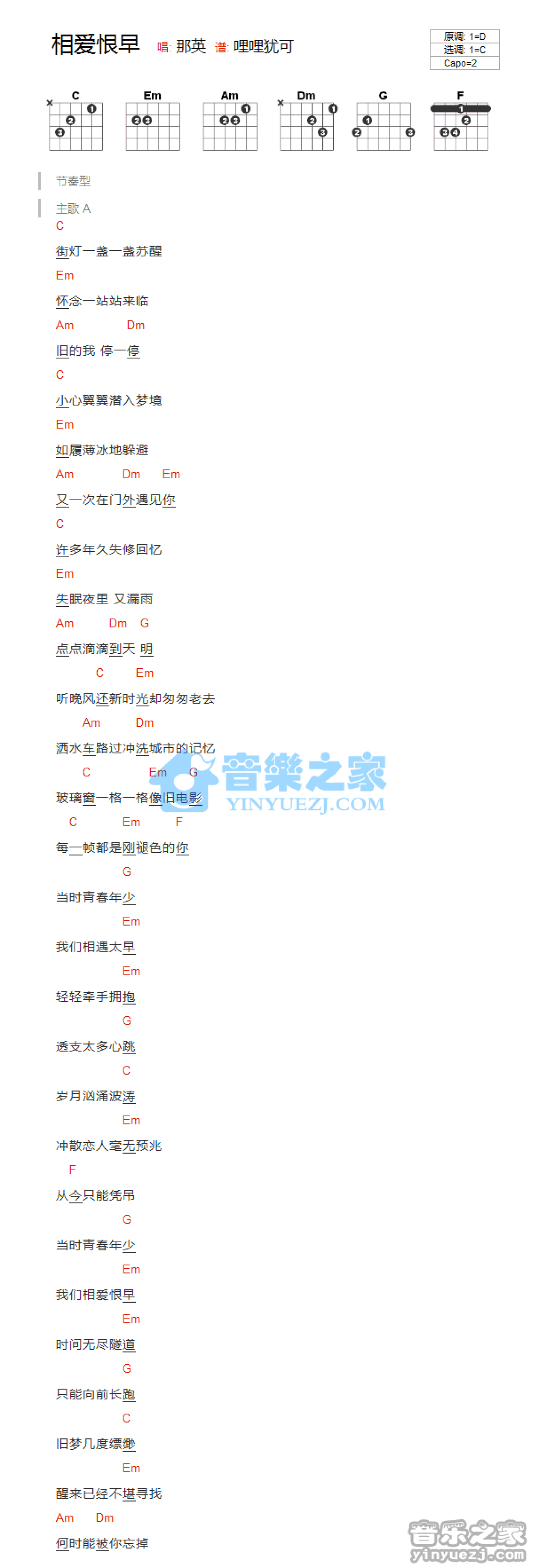 曲谱介绍: C调版那英《相爱恨早》吉他和弦弹唱谱