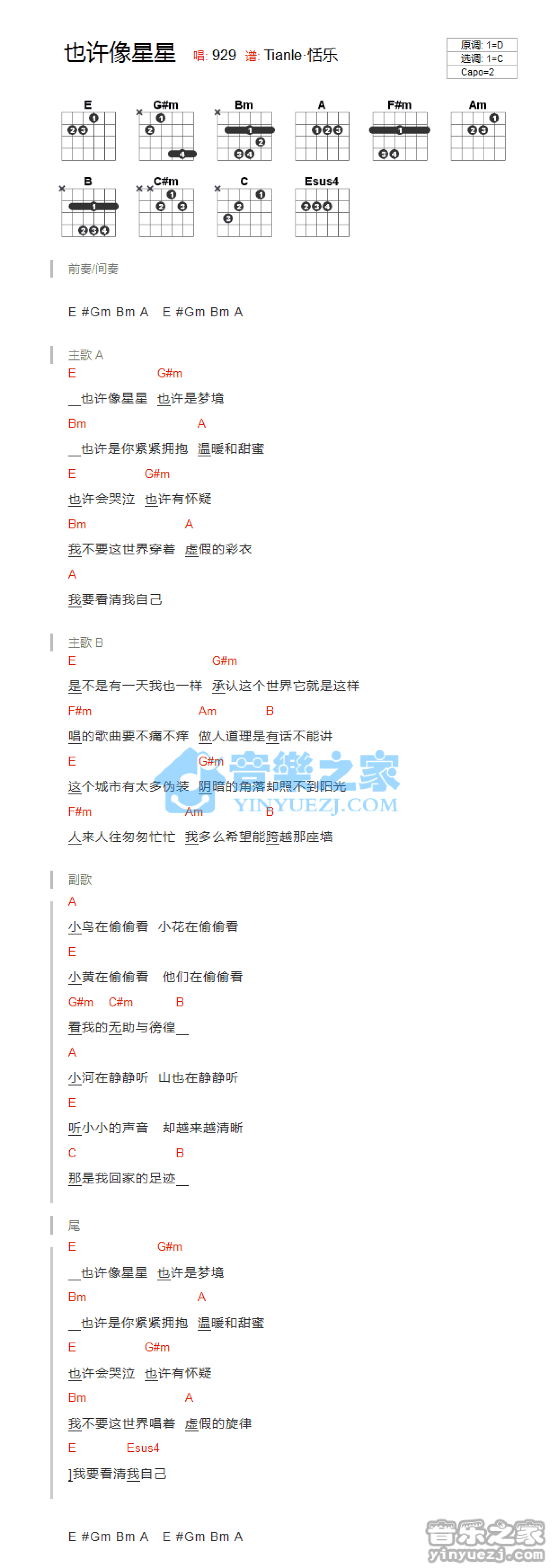 曲谱介绍: C调版929《也许像星星》吉他和弦弹唱谱
