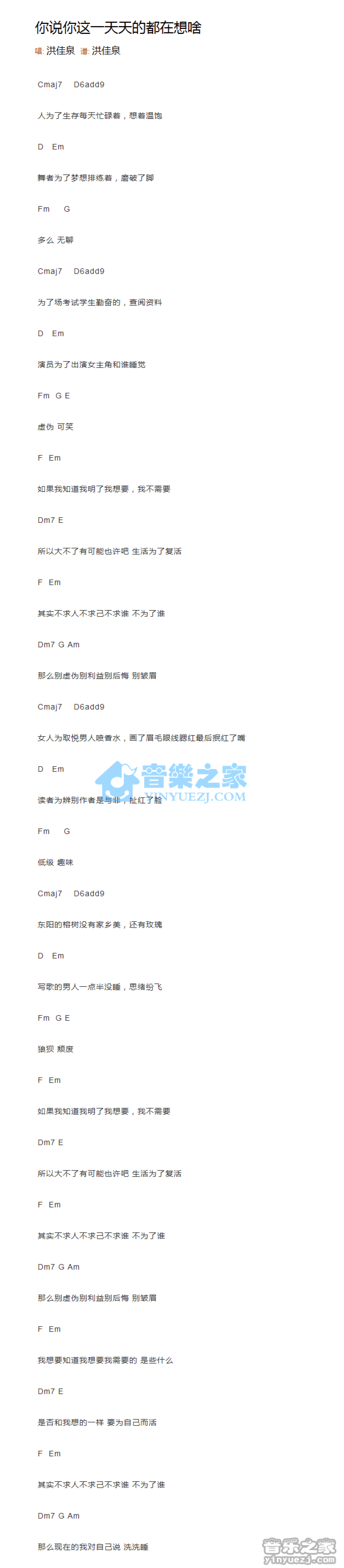 曲谱介绍: 洪佳泉《你说你这一天天的都在想啥》吉他和弦弹唱谱