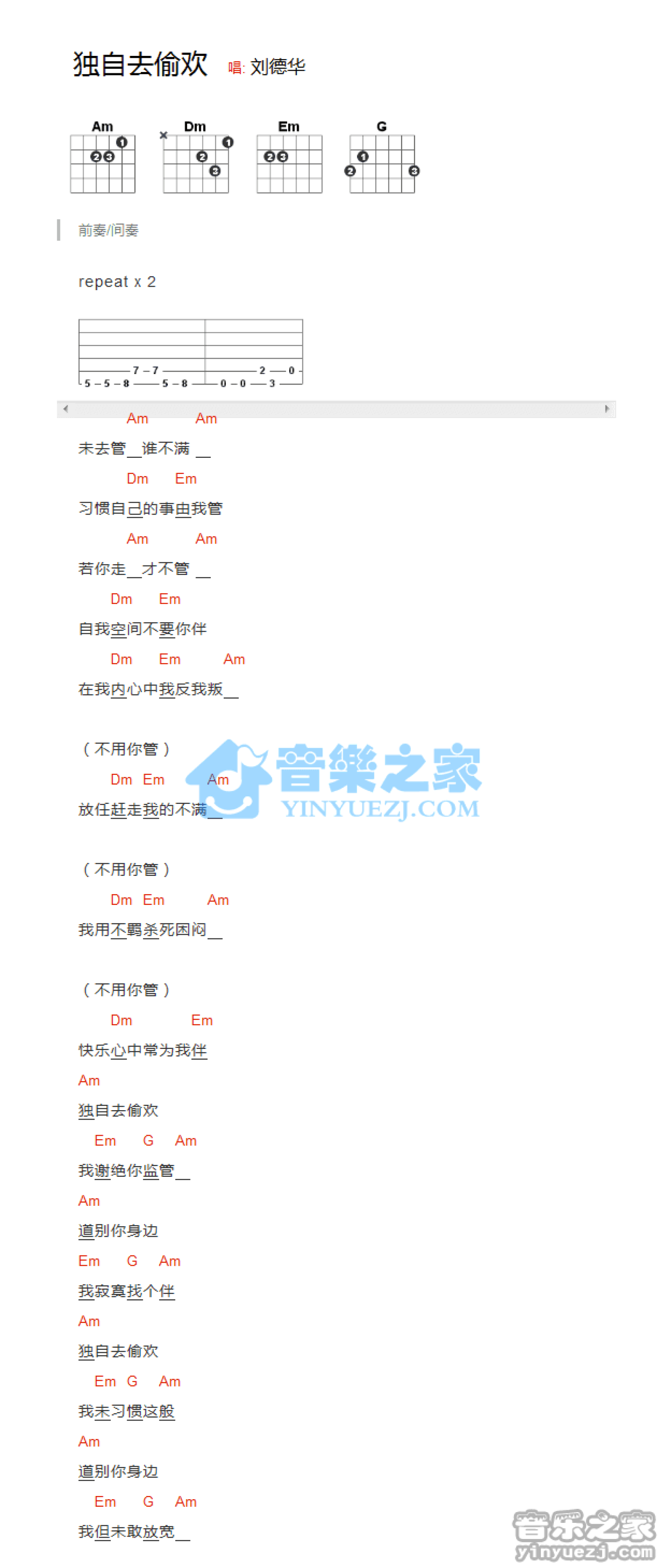 曲谱介绍: 刘德华《独自去偷欢》吉他和弦弹唱谱