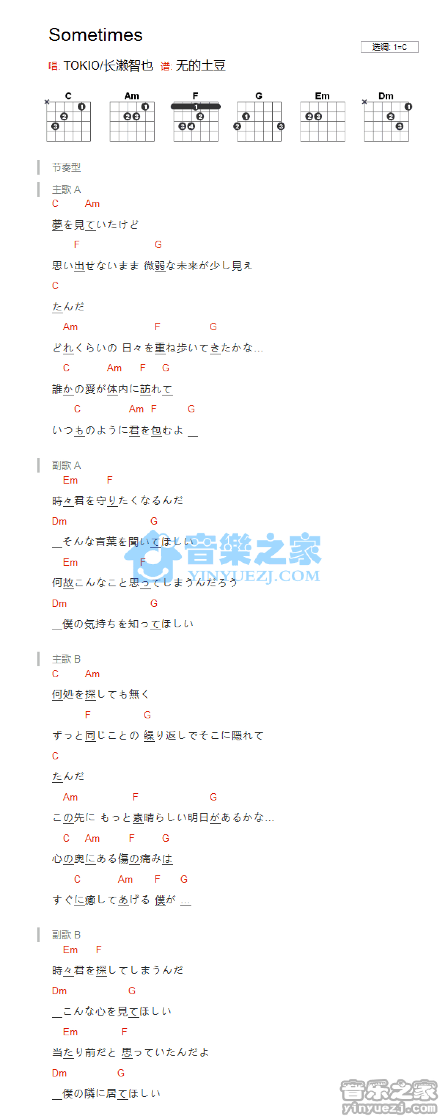 曲谱介绍: C调版Tokio《Sometimes》吉他和弦弹唱谱