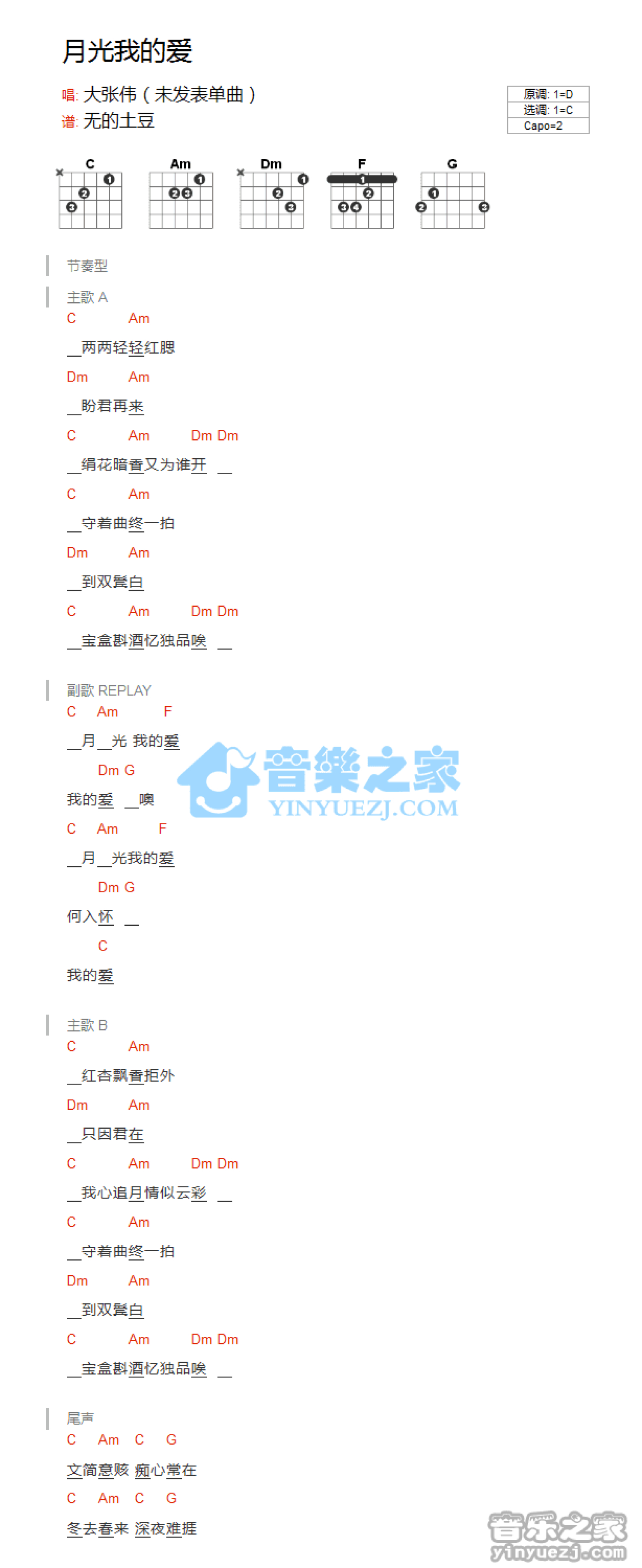 曲谱介绍: C调版《月光我的爱》吉他和弦弹唱谱