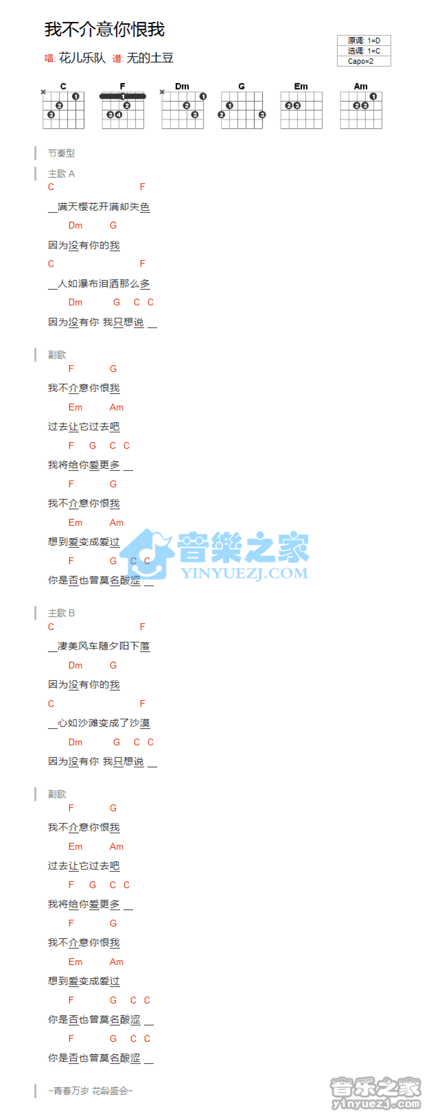 曲谱介绍: C调版花儿乐队《我不介意你恨我》吉他和弦弹唱谱