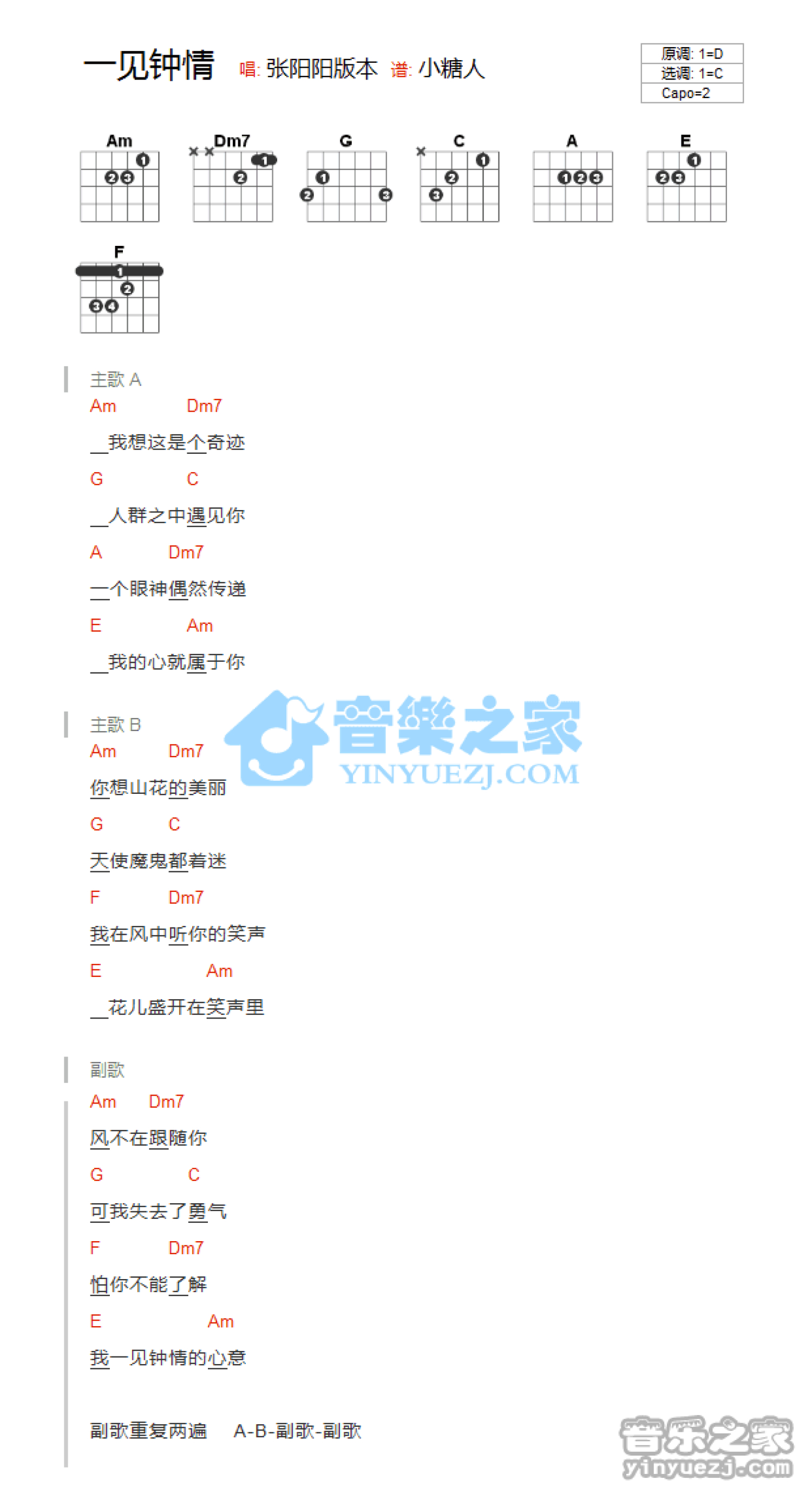 曲谱介绍: C调版张阳阳《一见钟情》吉他和弦弹唱谱