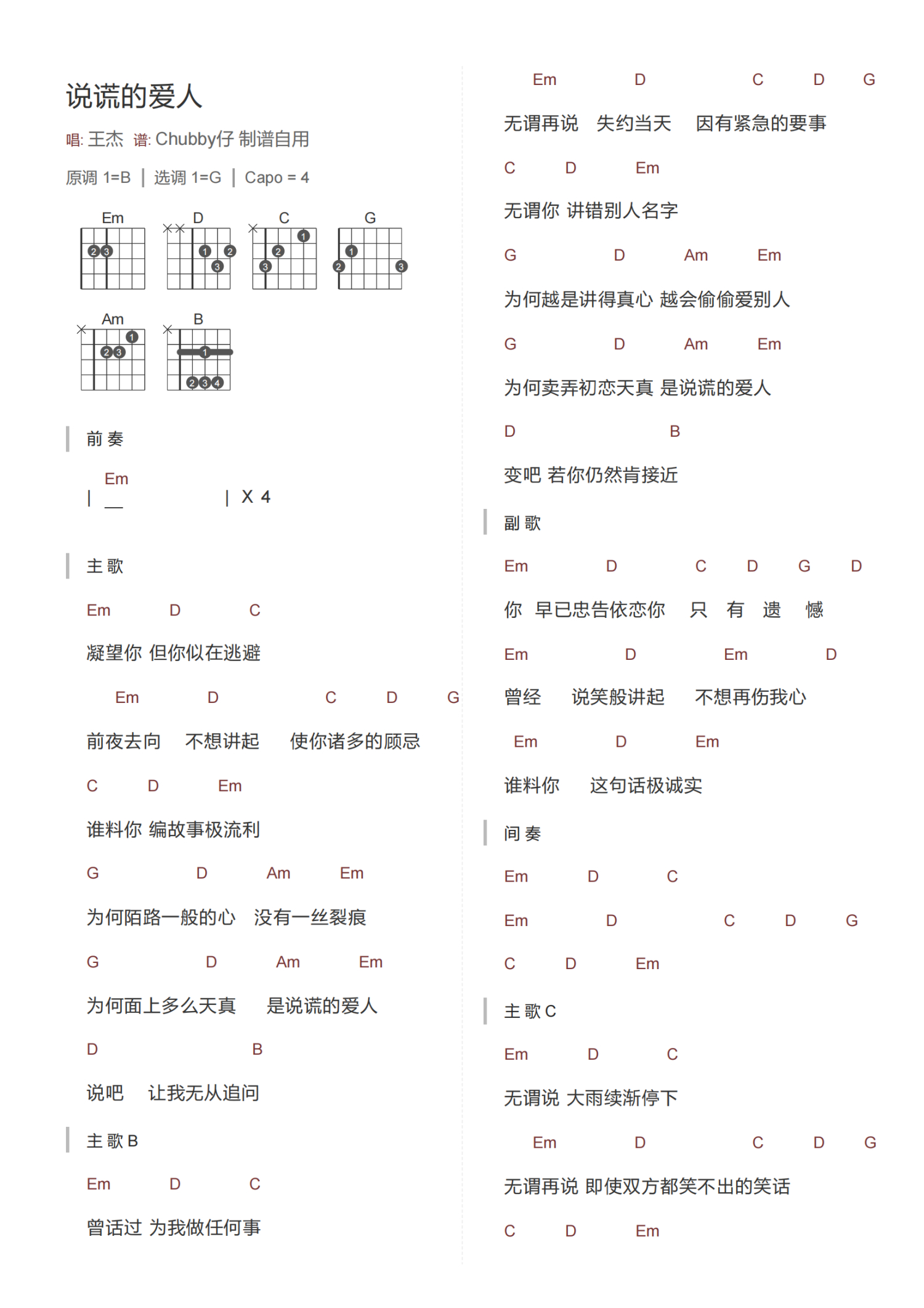 曲谱介绍: G调版王杰《说谎的爱人》吉他和弦弹唱谱