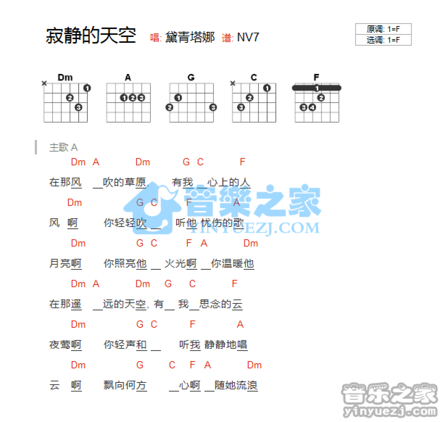 曲谱介绍: F调版黛青塔娜《寂静的天空》吉他和弦弹唱谱