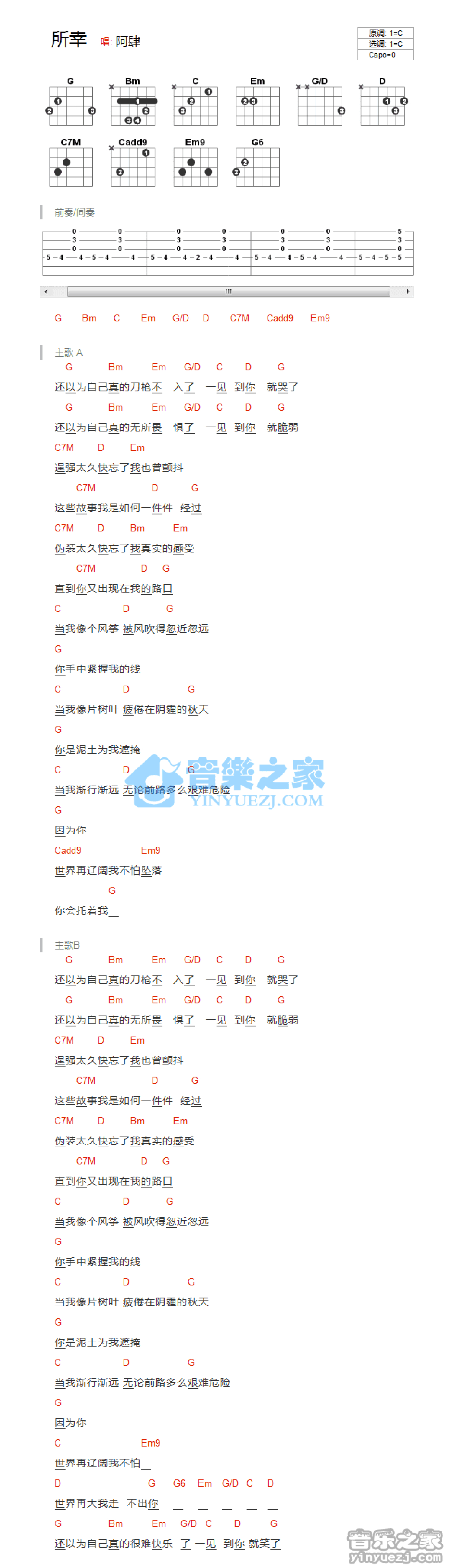 曲谱介绍: C调版阿肆《所幸》吉他和弦弹唱谱