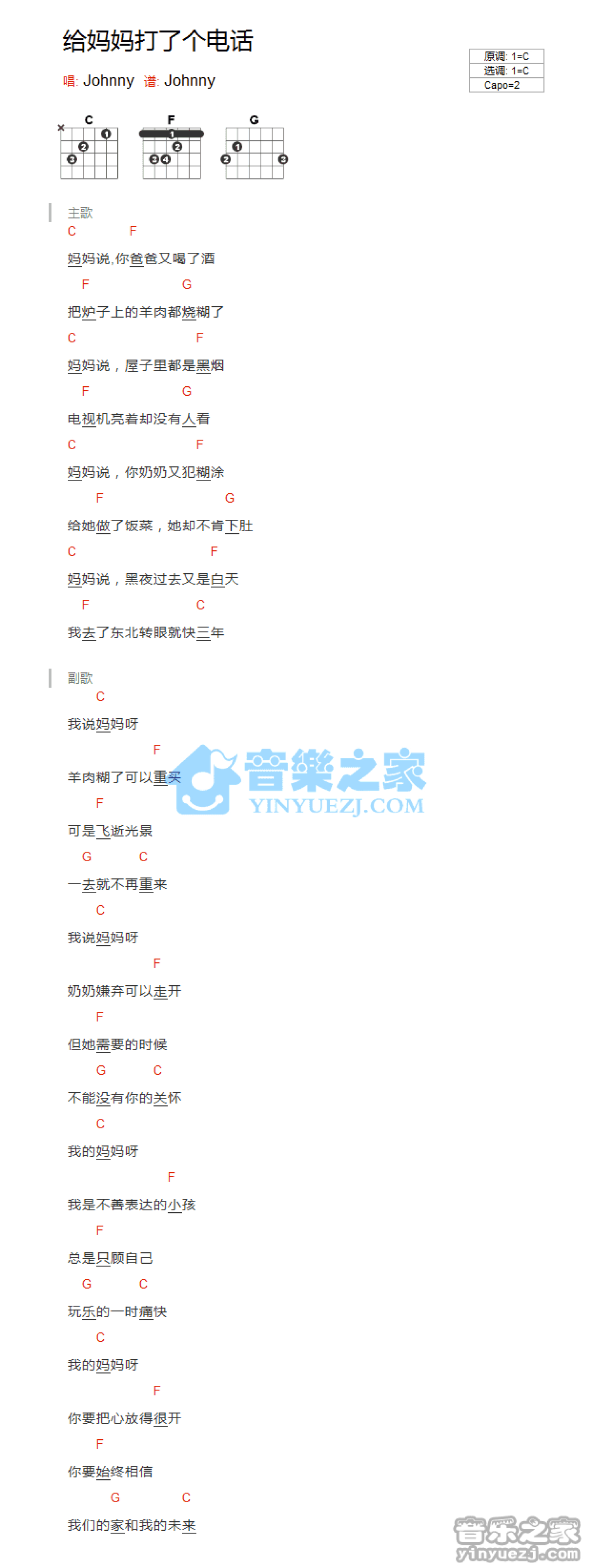 给妈妈打了个电话吉他谱 - Johnny - C调吉他弹唱谱 - 和弦谱
