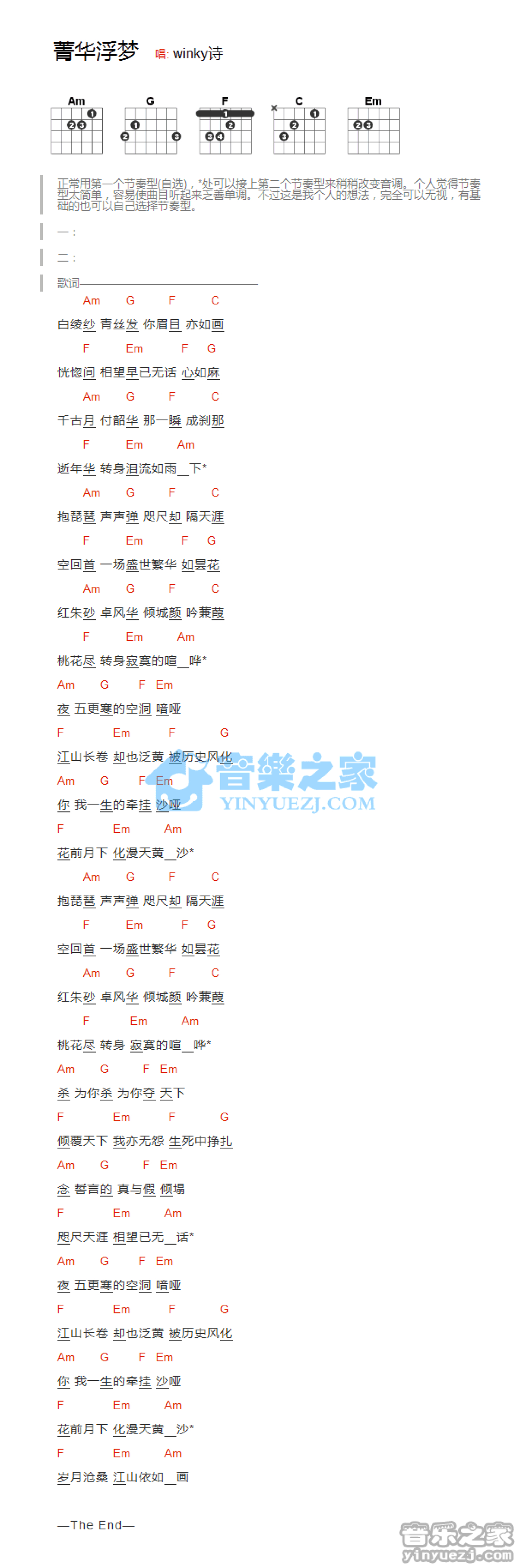 曲谱介绍: Winky诗《菁华浮梦》吉他和弦弹唱谱