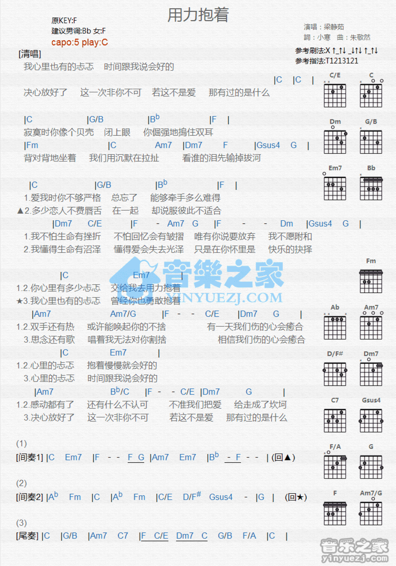 曲谱介绍: C调版梁静茹《用力抱着》吉他和弦弹唱谱