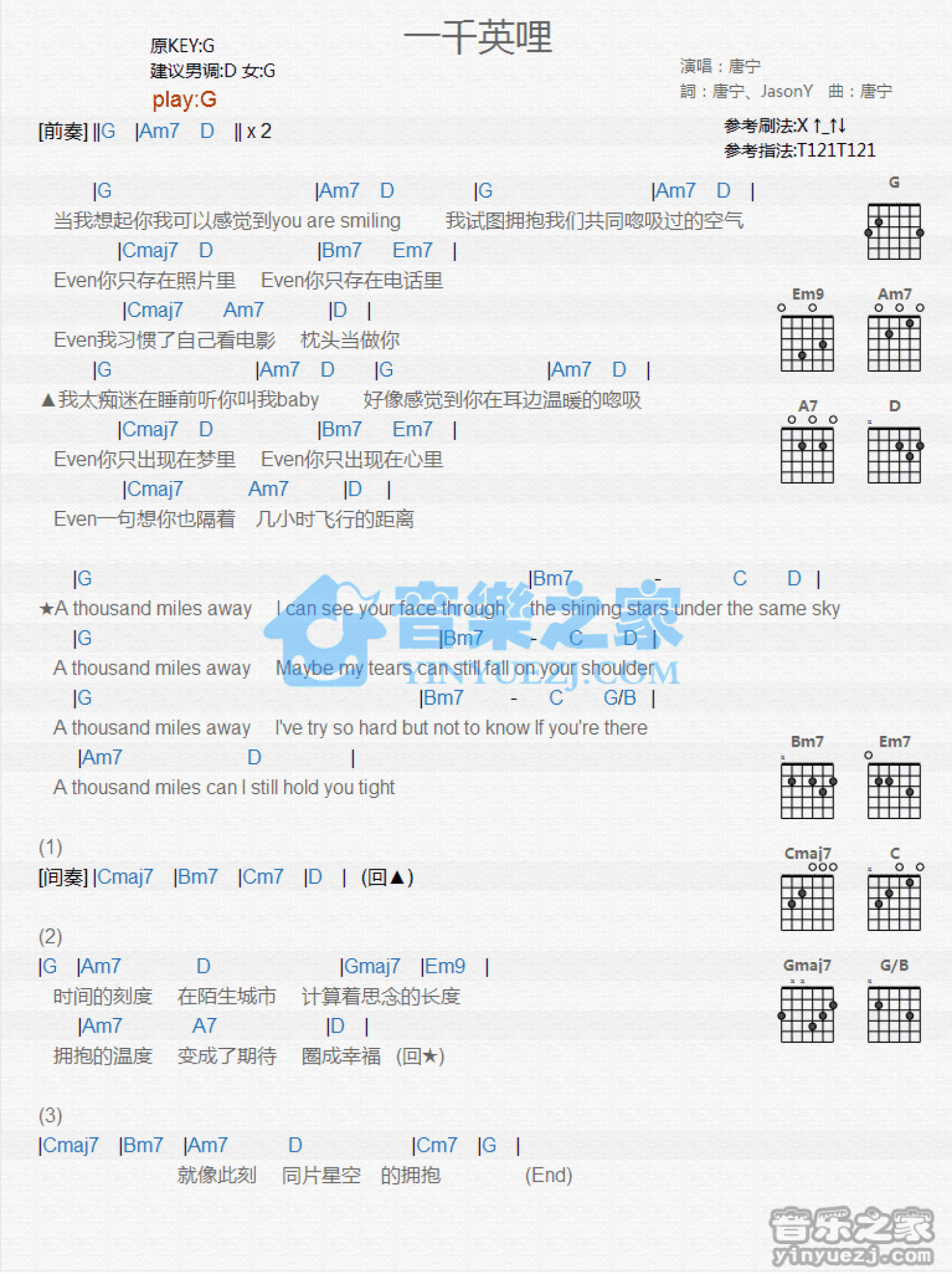 曲谱介绍: G调版唐宁《一千英里》吉他和弦弹唱谱