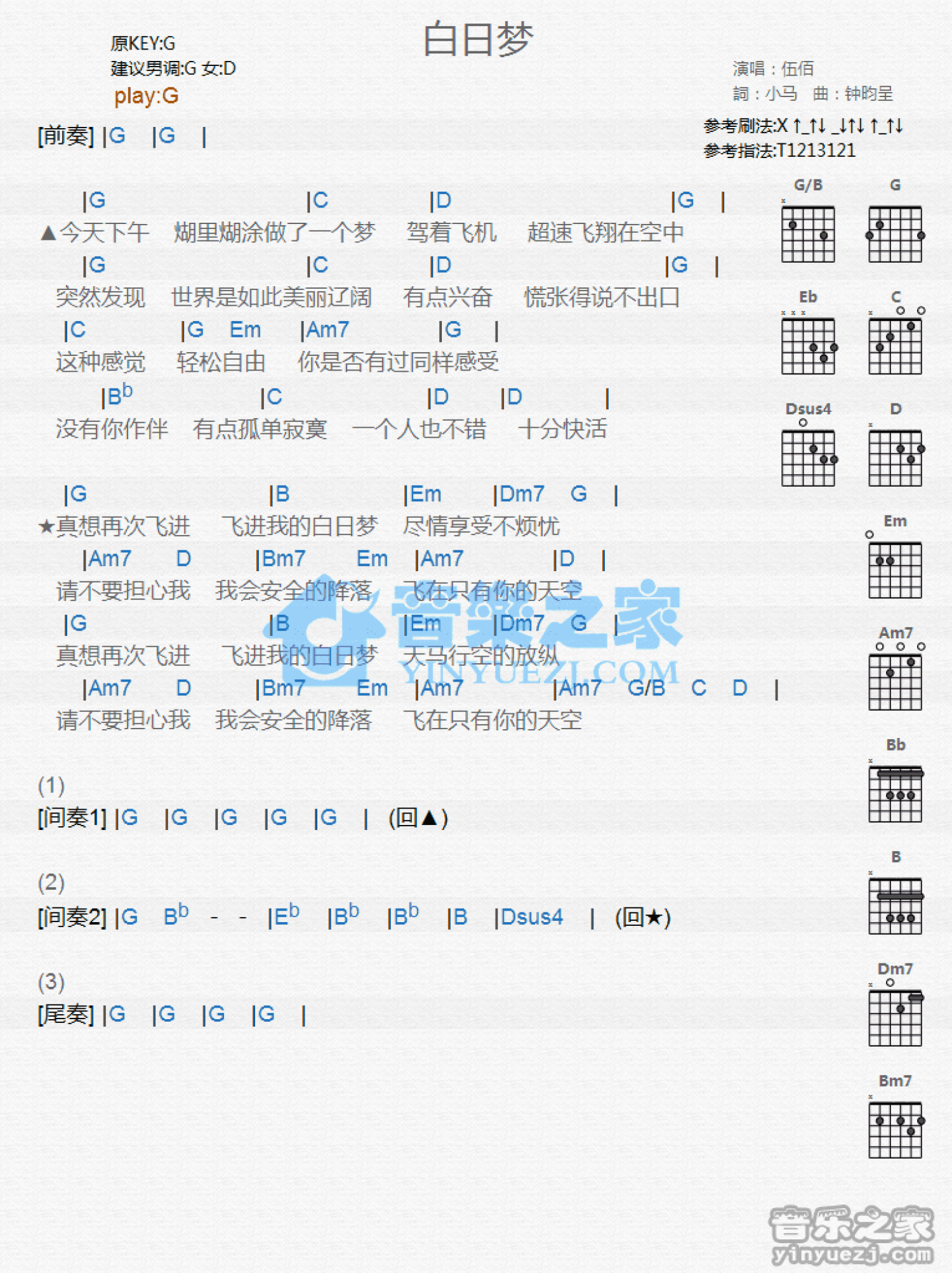 曲谱介绍: G调版伍佰《白日梦》吉他和弦弹唱谱
