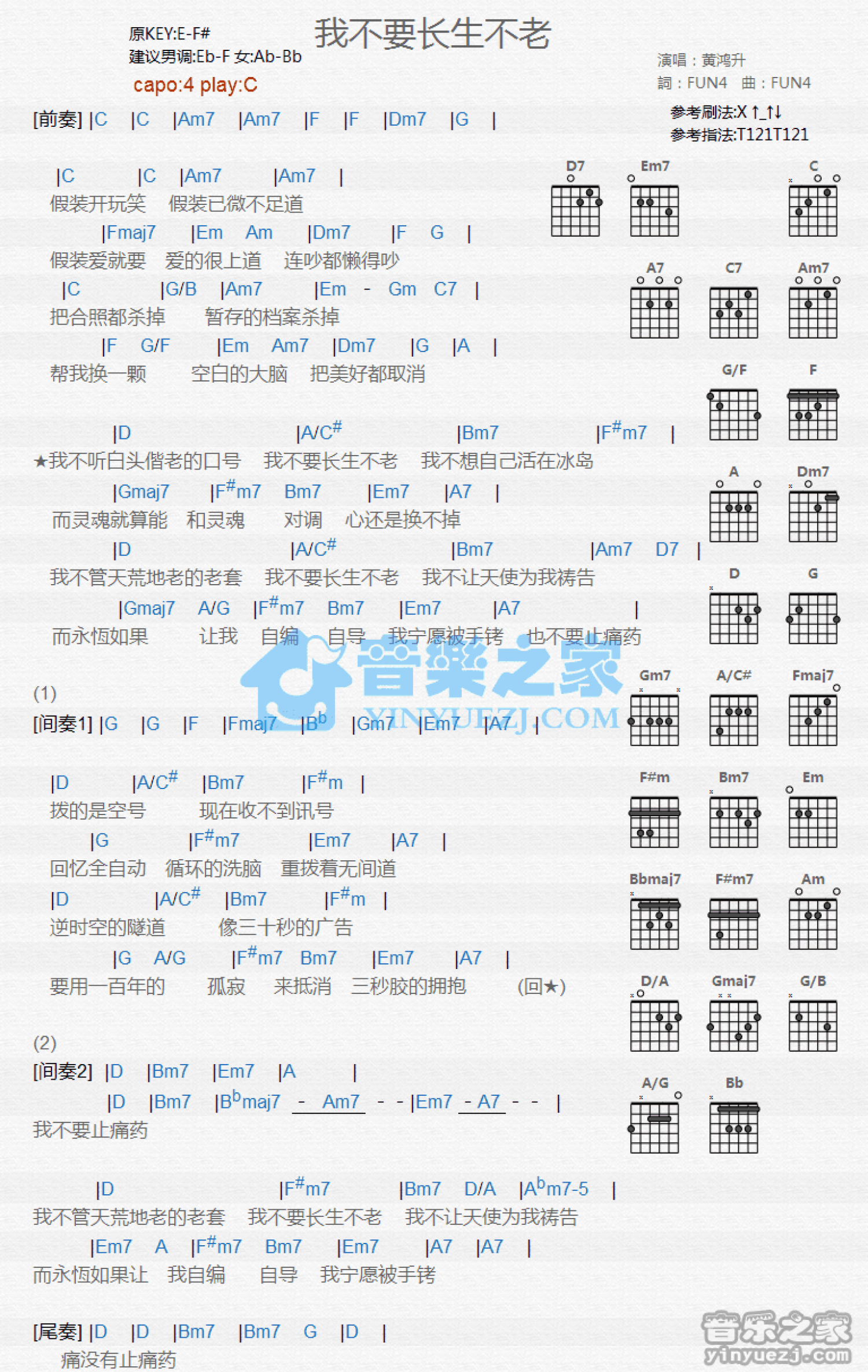 曲谱介绍: C调版黄鸿升《我不要长生不老》吉他和弦弹唱谱