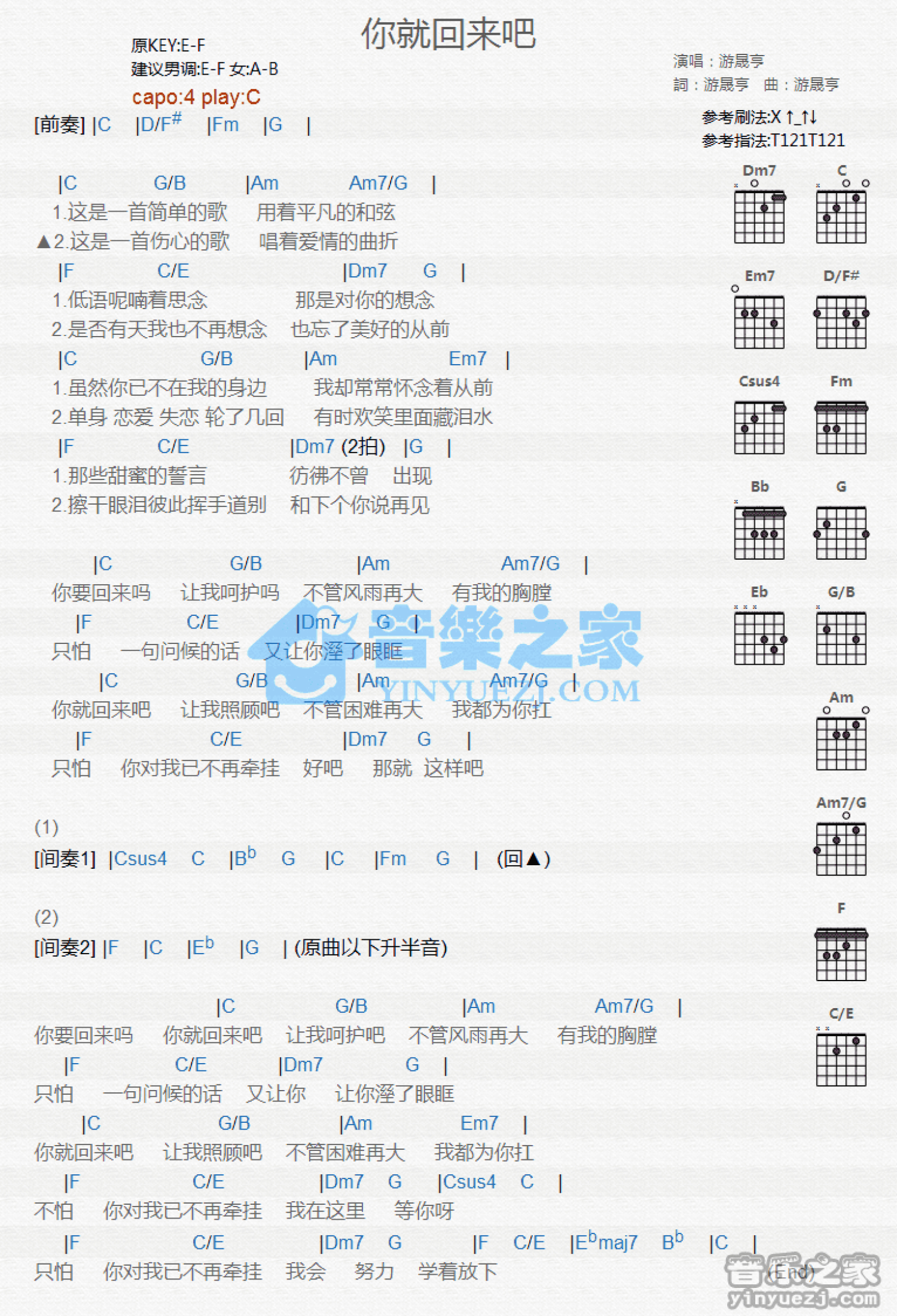 你就回来吧吉他谱 - 游晟亨 - C调吉他弹唱谱 - 和弦谱