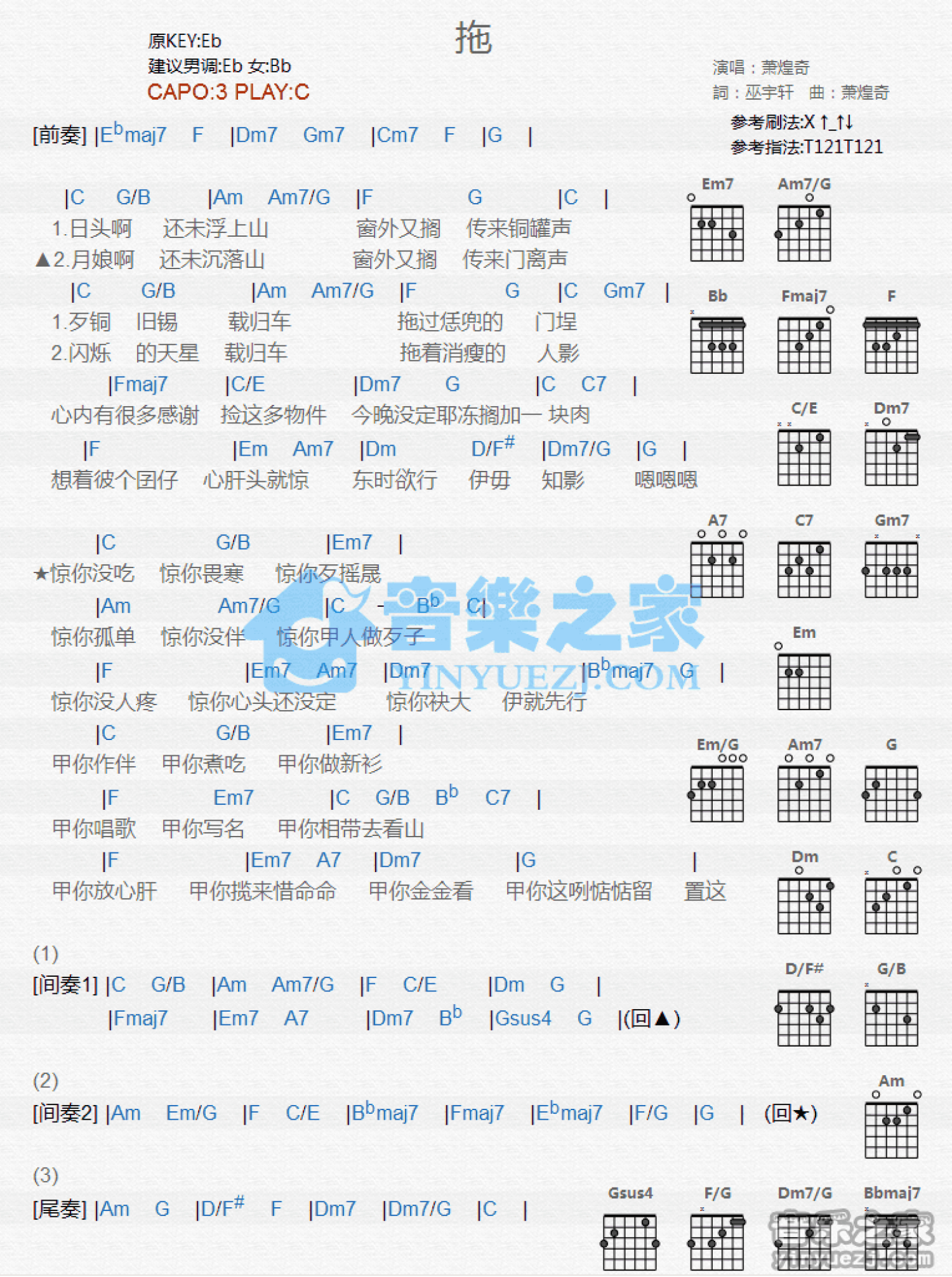 曲谱介绍: C调版萧煌奇《拖》吉他和弦弹唱谱