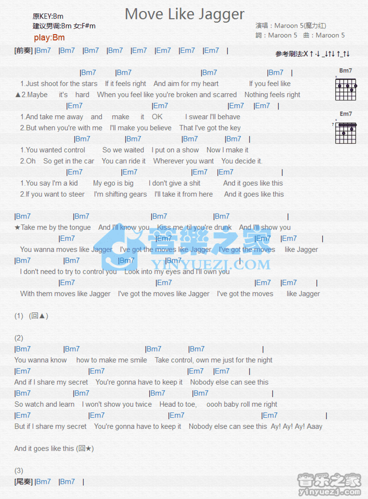曲谱介绍: Bm调版Maroon5《MoveLikeJagger》吉他和弦弹唱谱