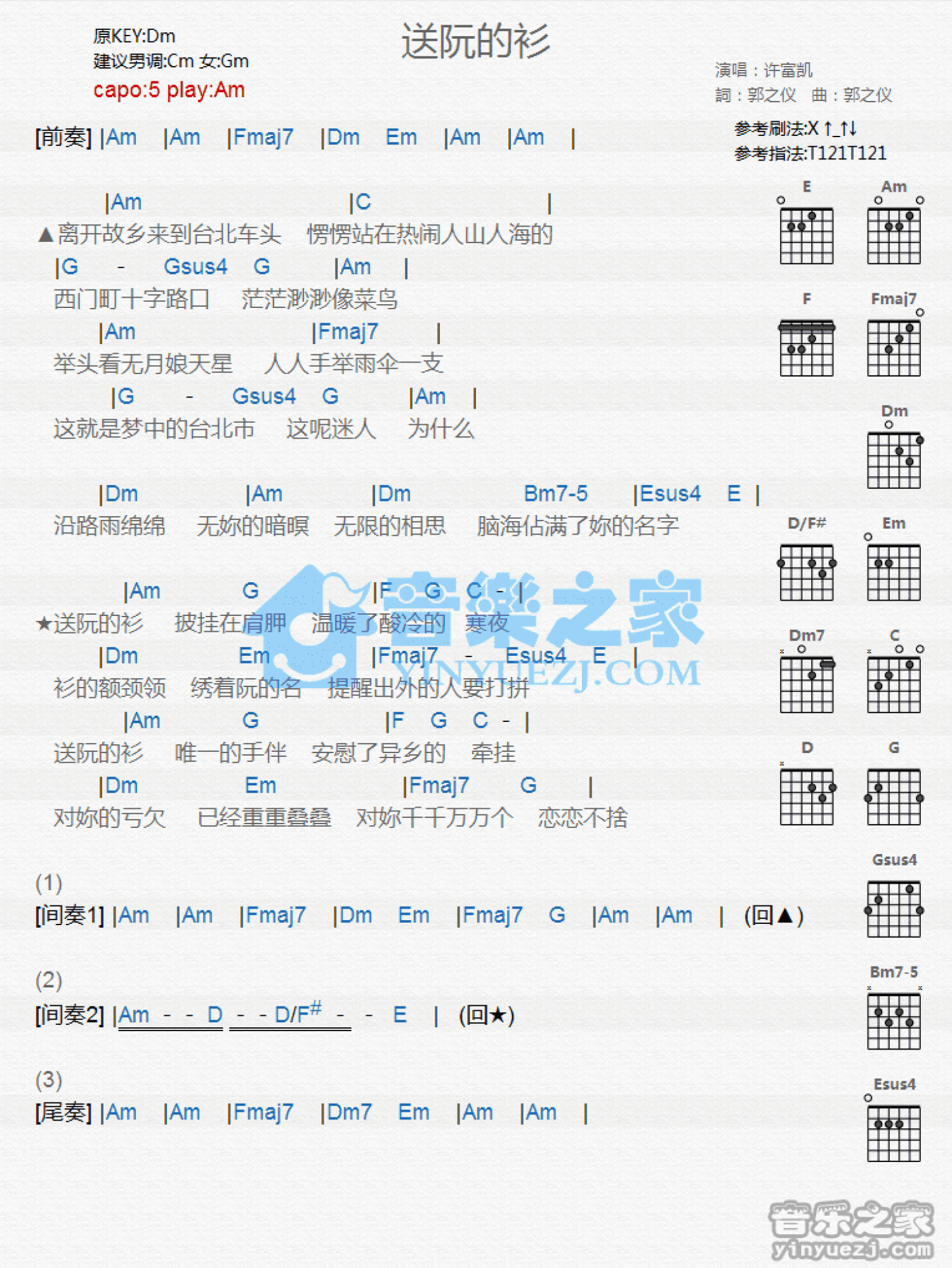 曲谱介绍: Am调版许富凯《送阮的衫》吉他和弦弹唱谱