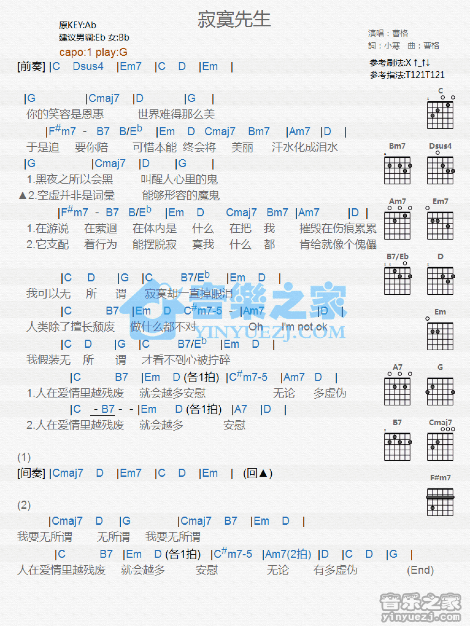 寂寞先生吉他谱 - 曹格 - G调吉他弹唱谱 - 和弦谱