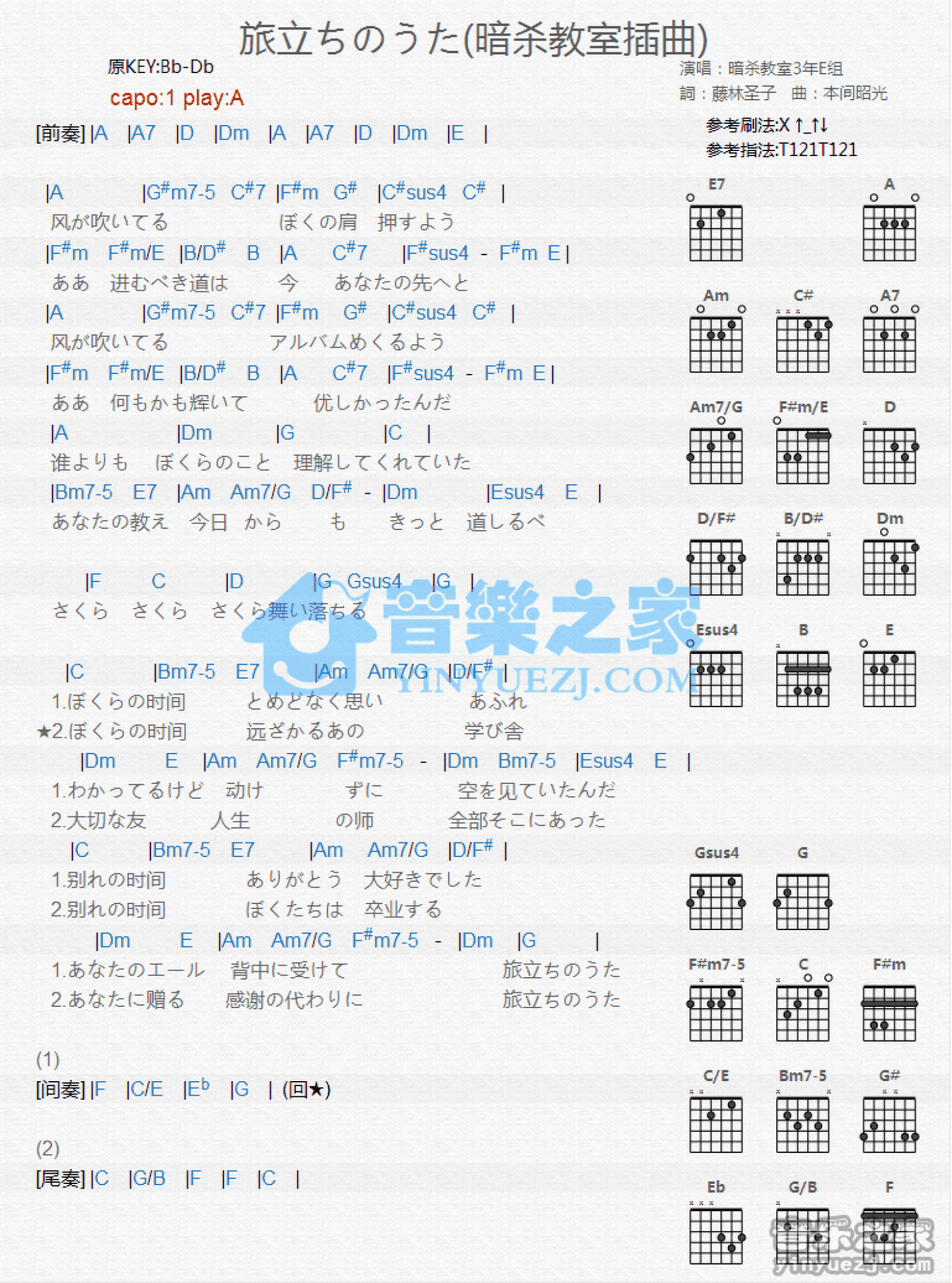 曲谱介绍: A调版暗杀教室插曲《旅立ちのうた》吉他和弦弹唱谱