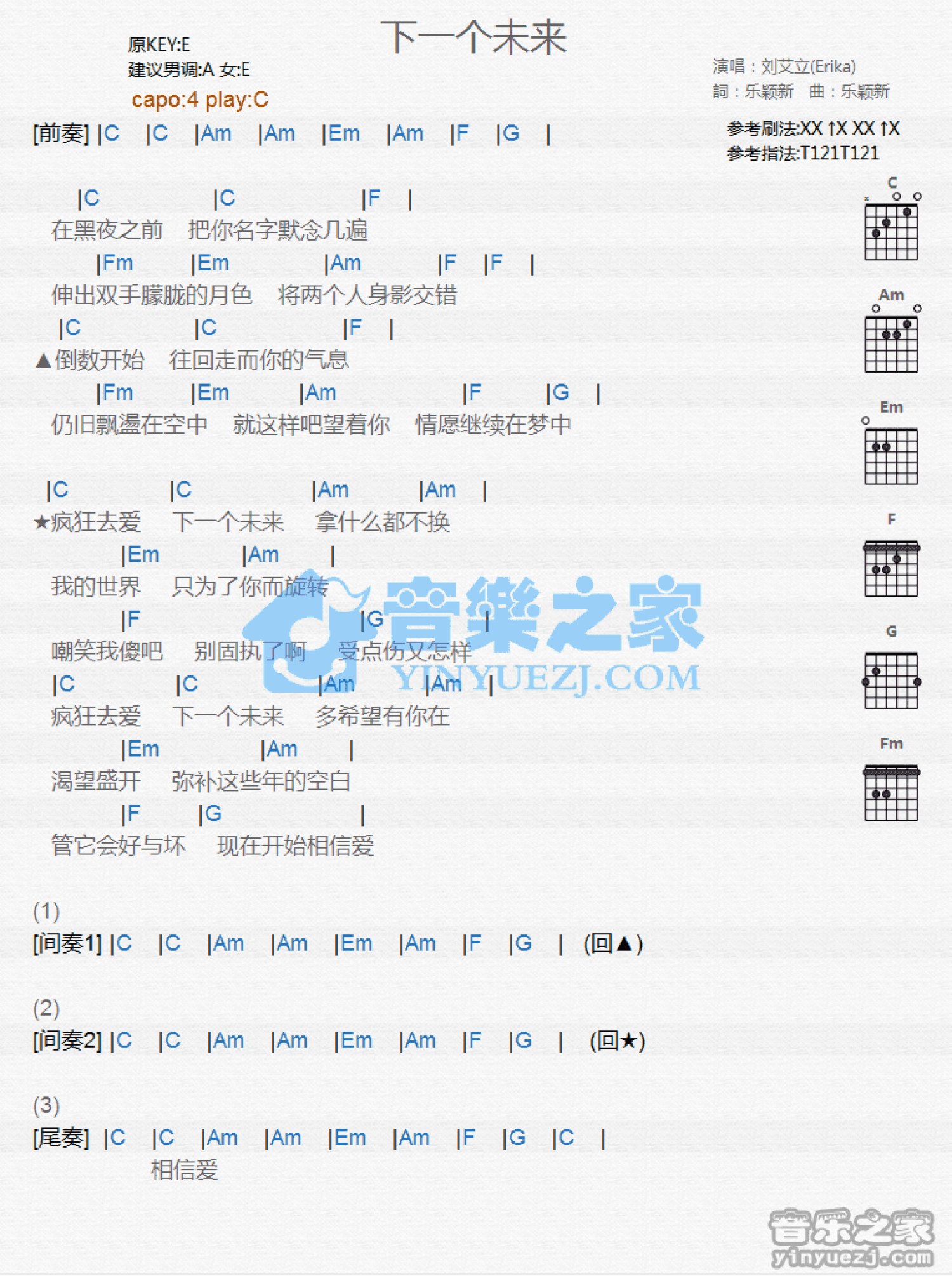 曲谱介绍: C调版刘艾立《下一个未来》吉他和弦弹唱谱