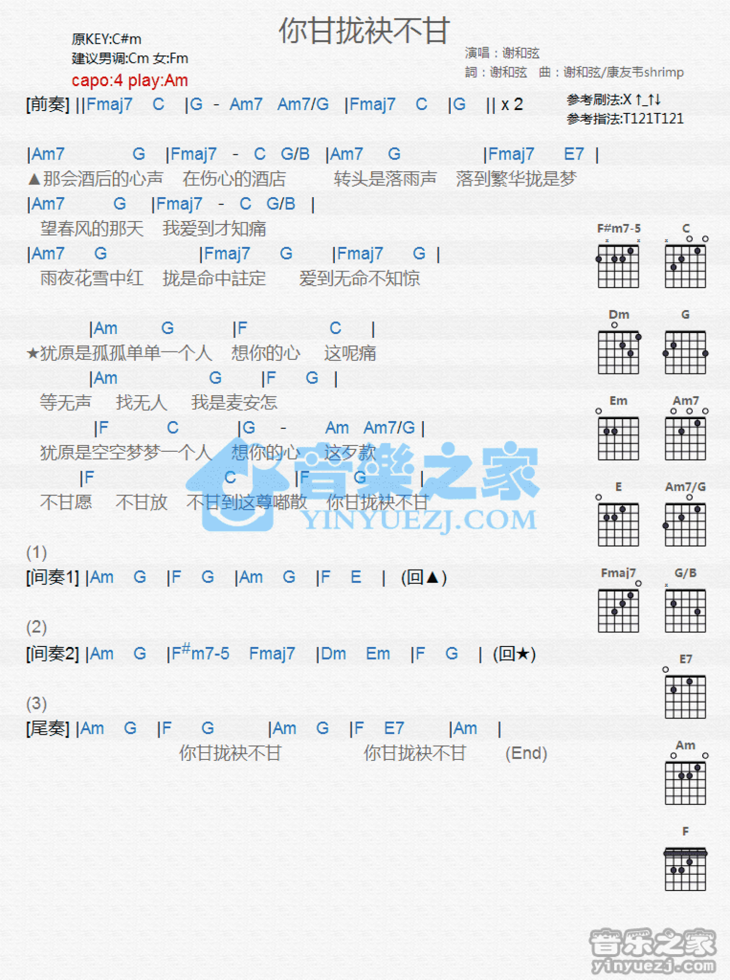 曲谱介绍: Am调版谢和弦《你甘拢袂不甘》吉他和弦弹唱谱