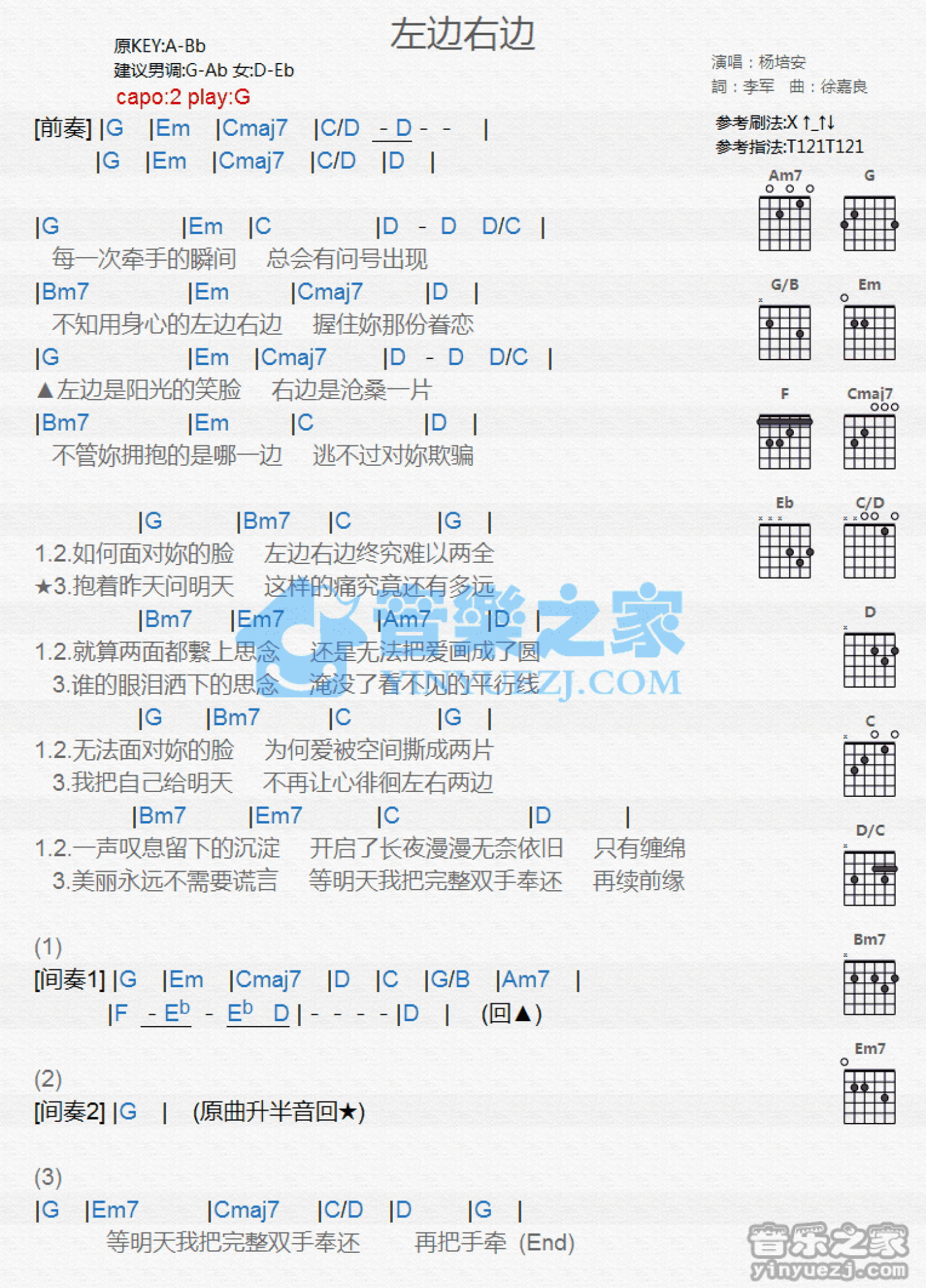 左边右边吉他谱 - 杨培安 - G调吉他弹唱谱 - 和弦谱