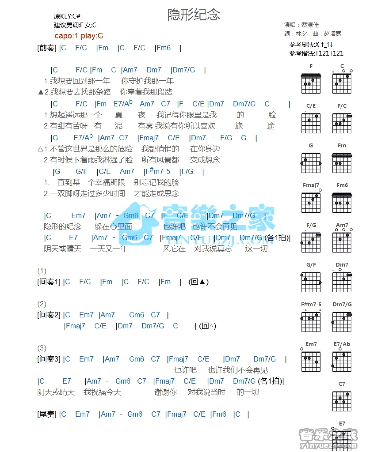 曲谱介绍: C调版 蔡淳佳《隐形纪念》吉他和弦弹唱谱