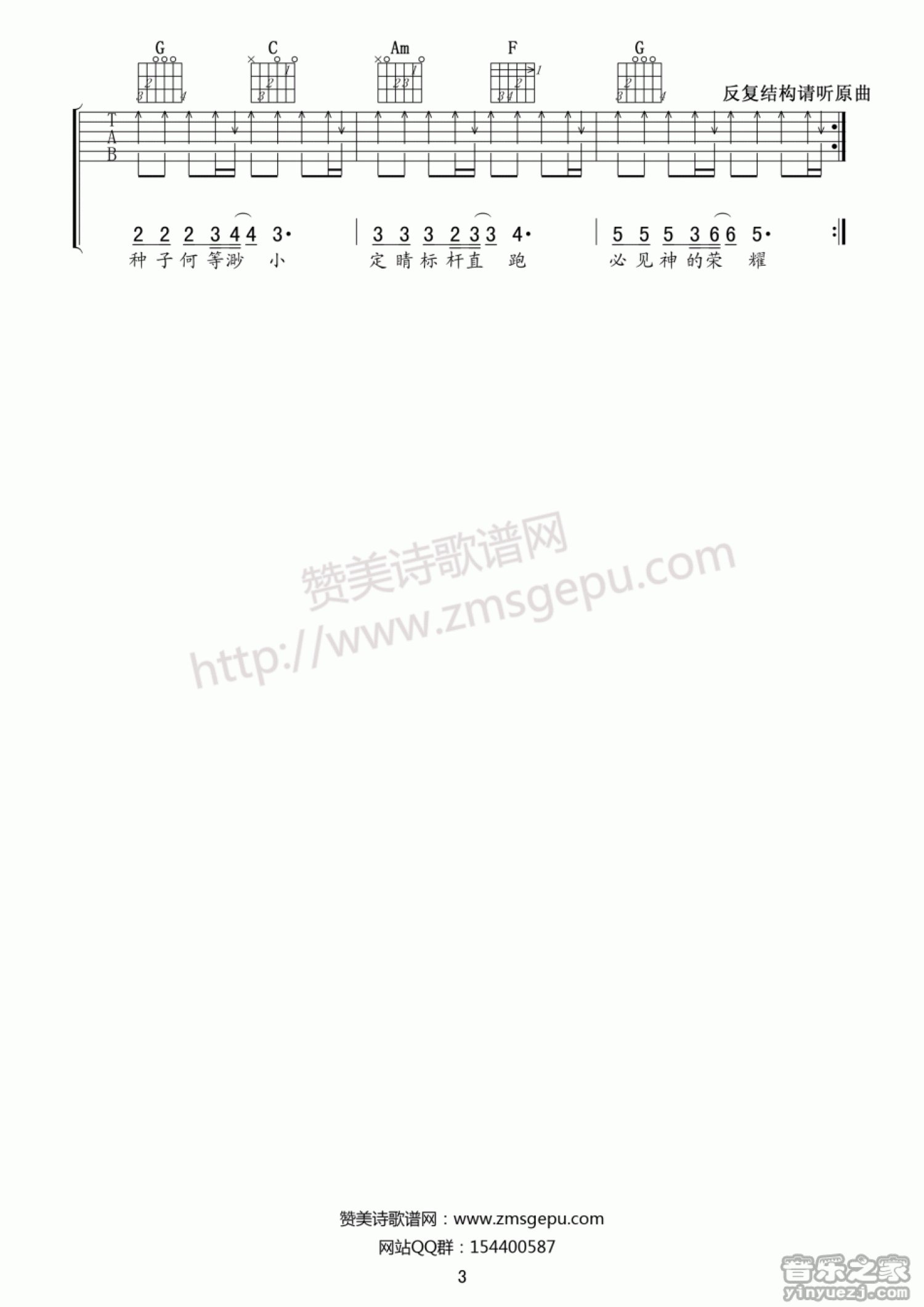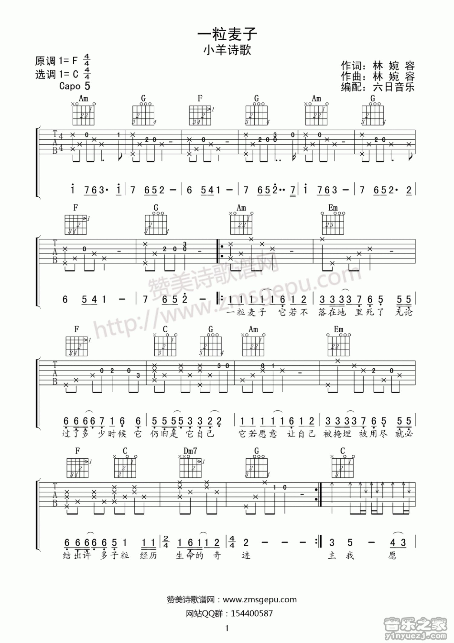 曲谱介绍: C调简单版小羊诗歌《一粒麦子》吉他弹唱谱