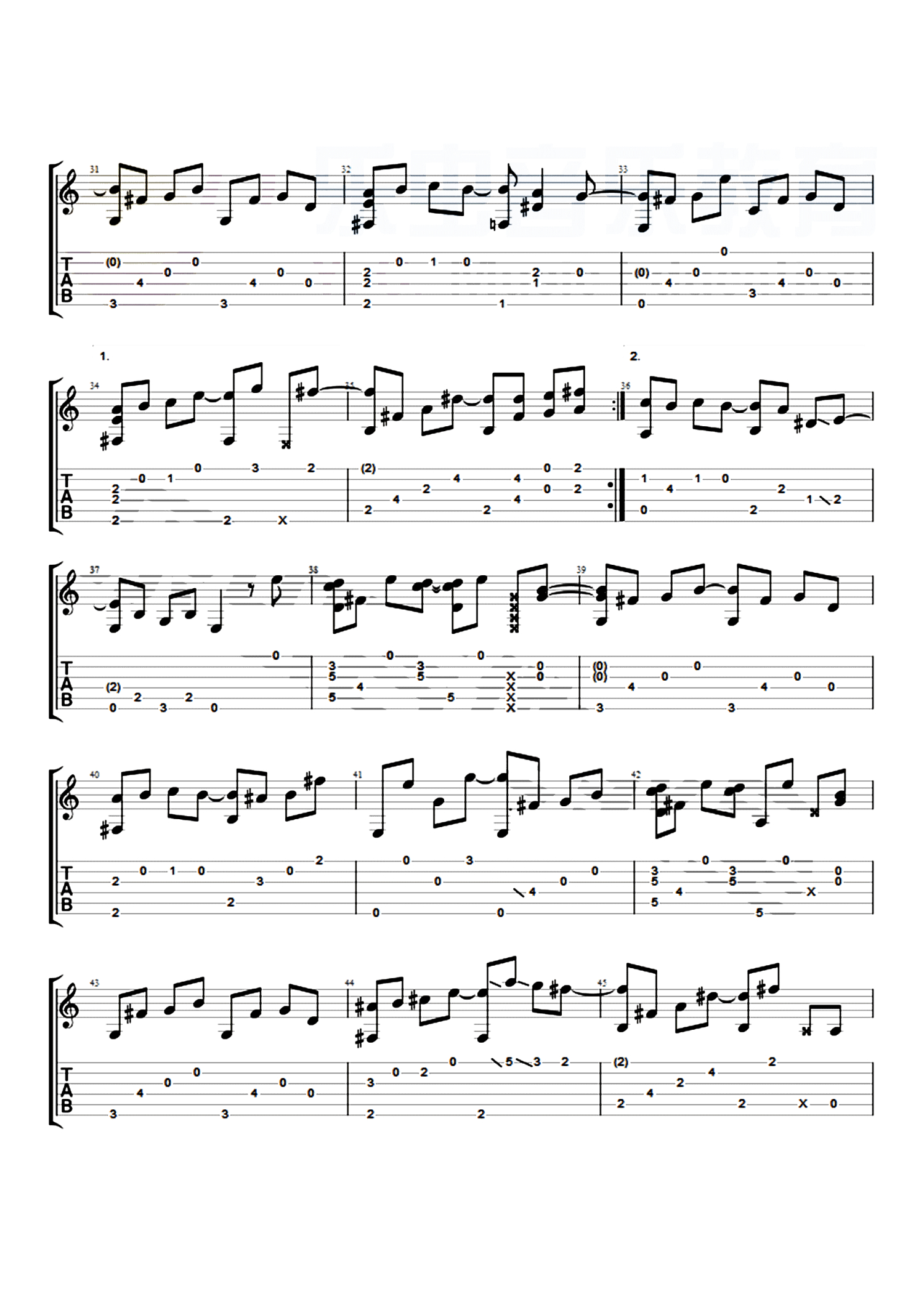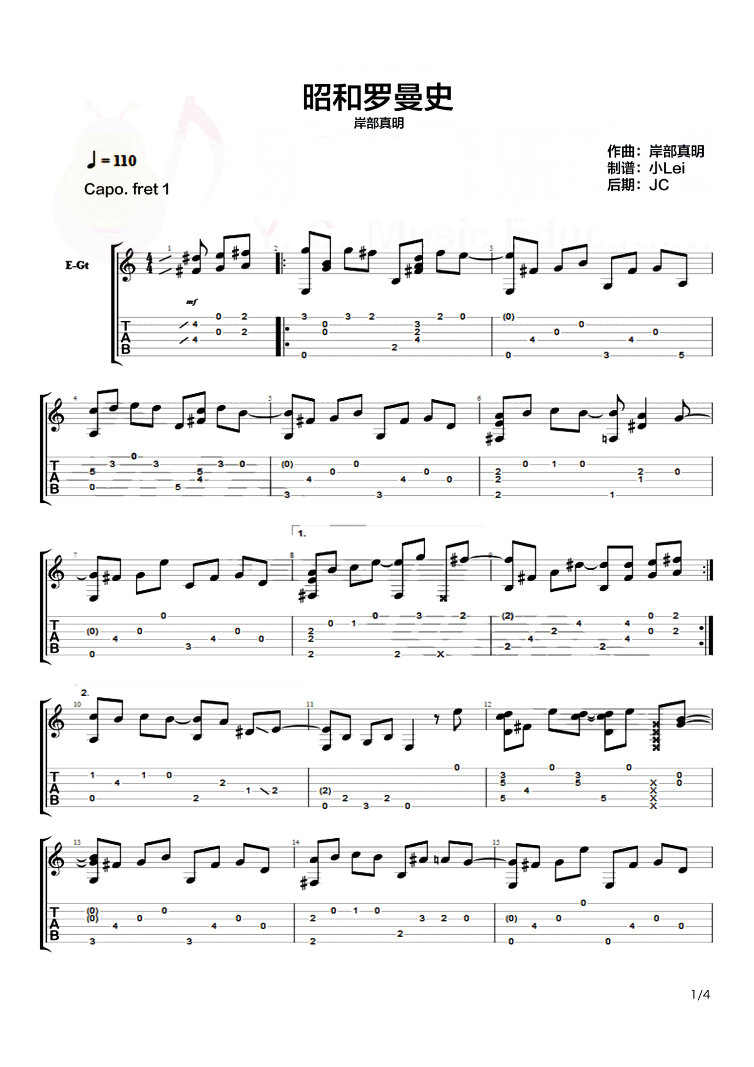曲谱介绍: CAPO夹一品,随谱附上《昭和罗曼史》指弹吉他视频,大家参照演示学习。这首旋律优美浪漫的曲子,来自于岸部真明2013年新专辑里,一首难得不用特殊调弦的曲子《昭和罗曼史》,非常喜欢,相信通过这首曲子的练习琴友们感觉到节奏和右手重要性。