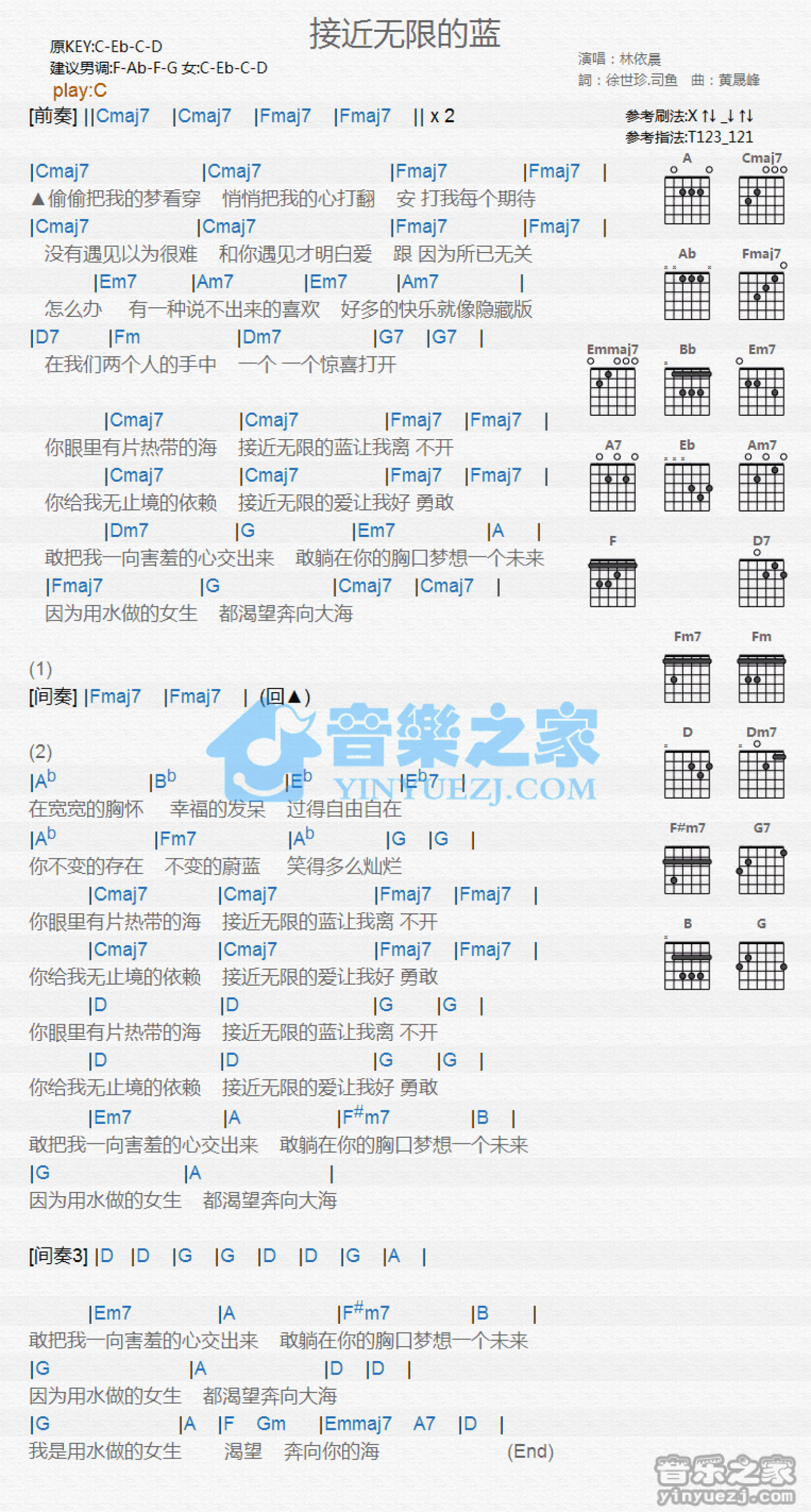 曲谱介绍: C调版林依晨《接近无限的蓝》吉他和弦弹唱谱