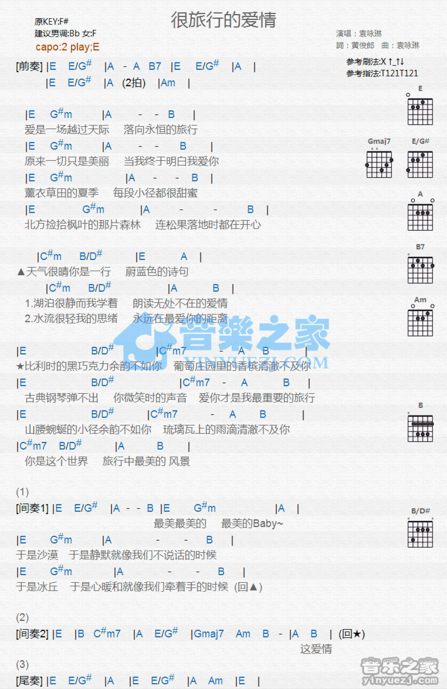 曲谱介绍: E调版袁咏琳《很旅行的爱情》吉他和弦弹唱谱