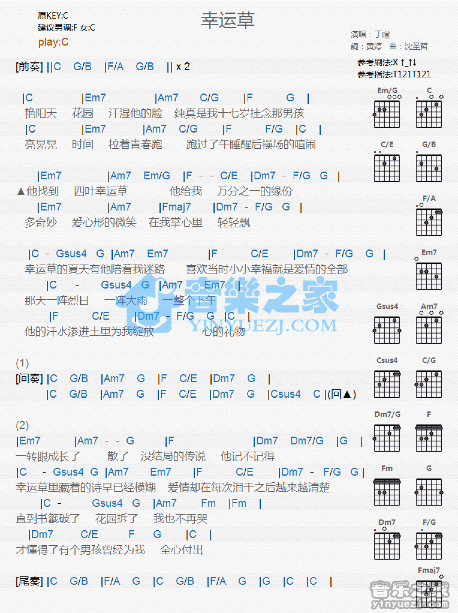 曲谱介绍: C调版丁当《幸运草》吉他和弦弹唱谱