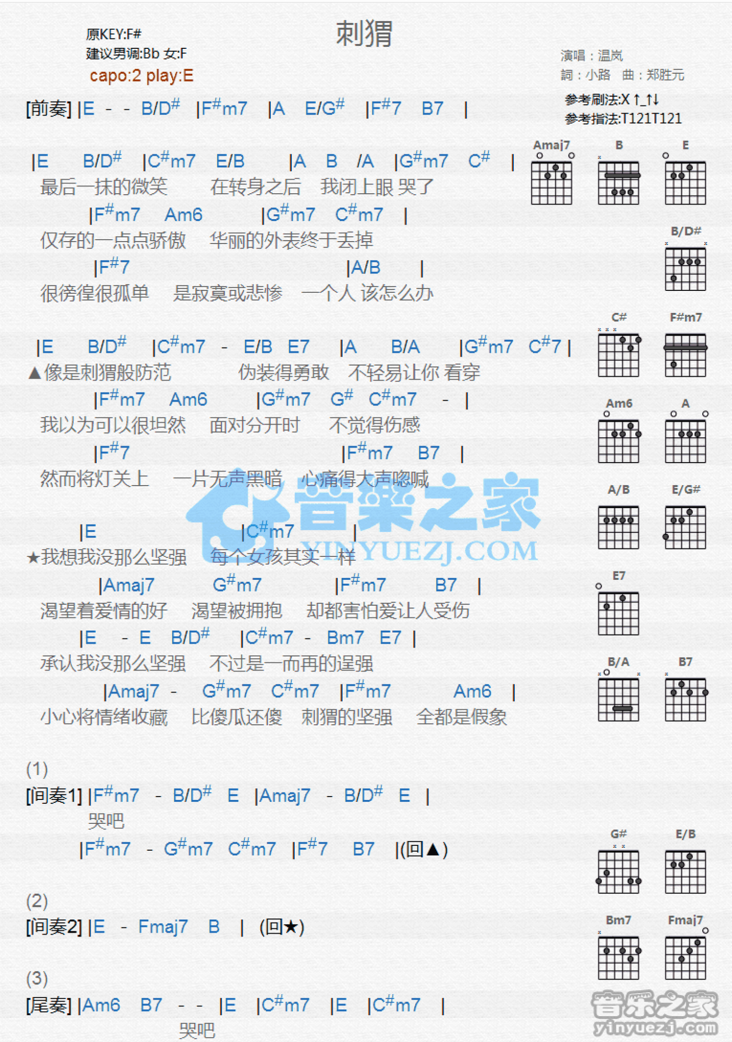 曲谱介绍: E调版温岚《刺猬》吉他和弦弹唱谱