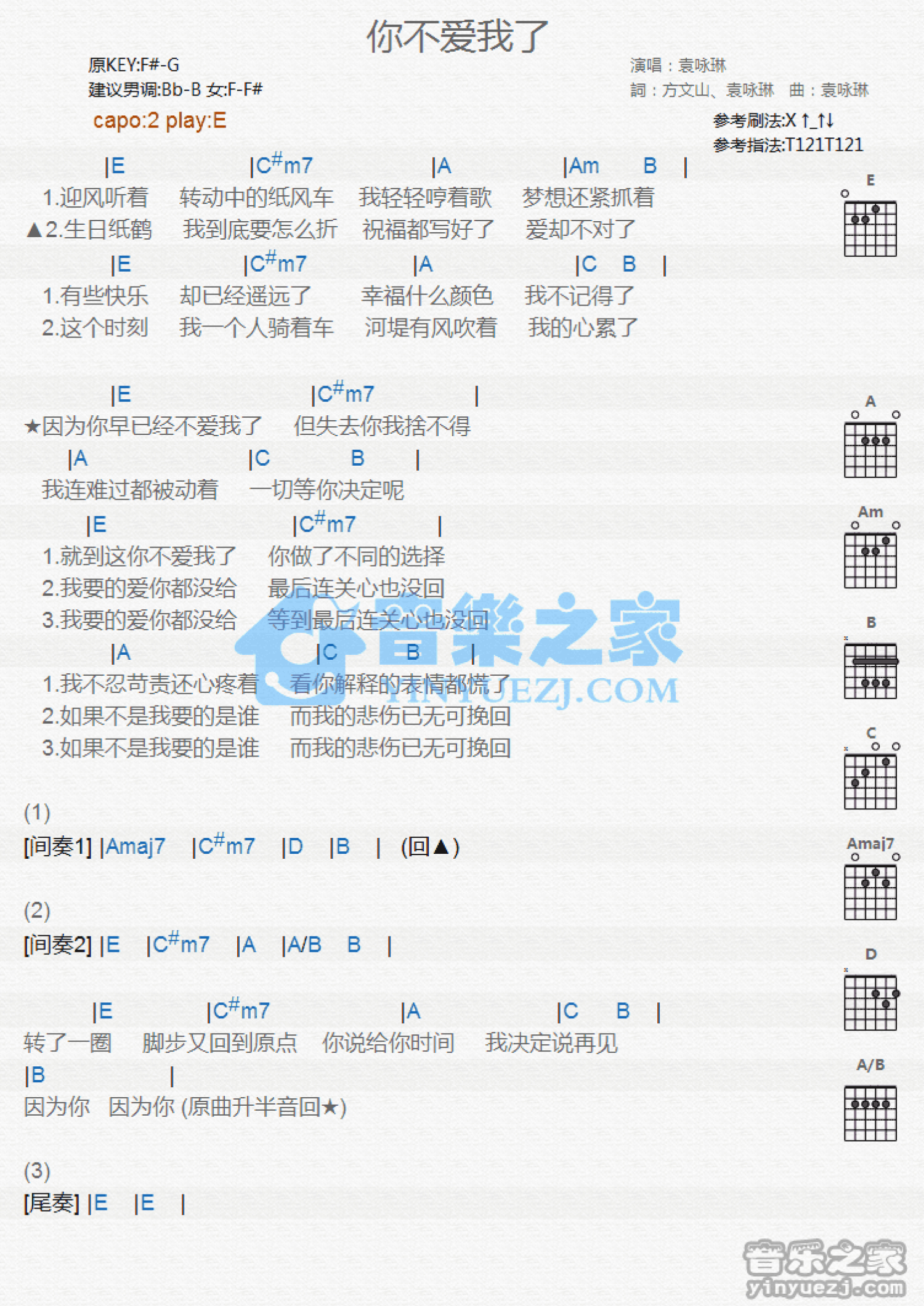 曲谱介绍: E调版《你不爱我了》吉他和弦弹唱谱